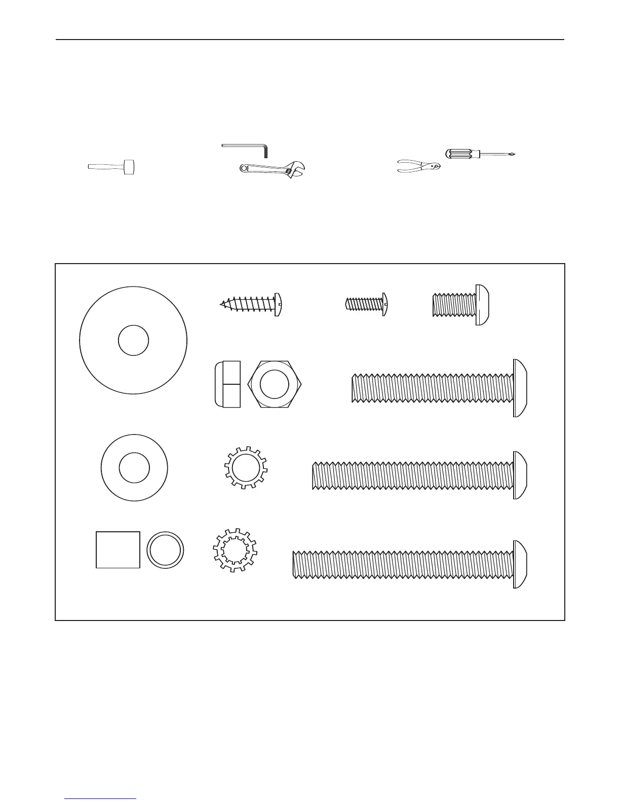 Use the drawings below to identify the assembly hardware. The number in parentheses below each drawing is