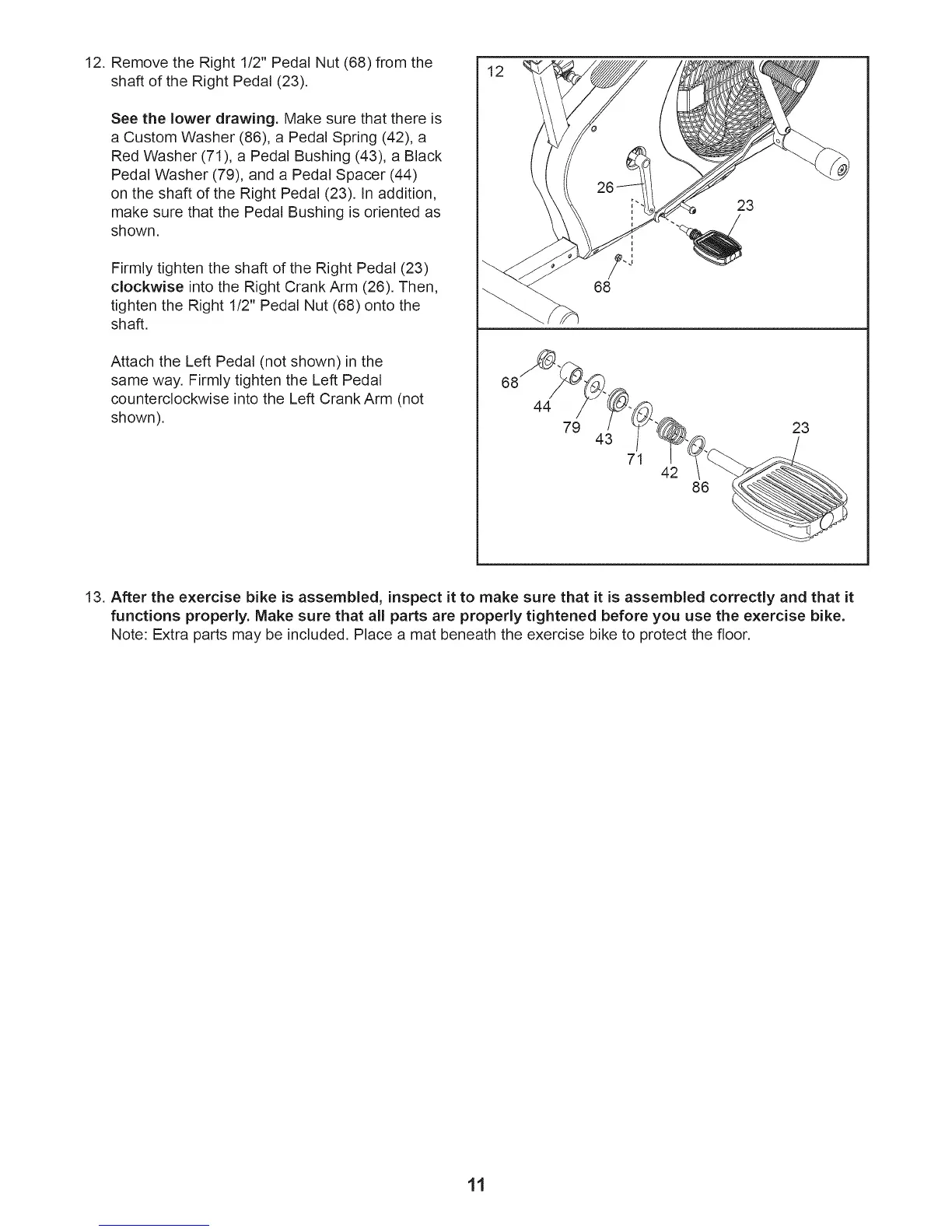 13. After the exercise bike is assembled, inspect it to make sure that it is assembled correctly and that it