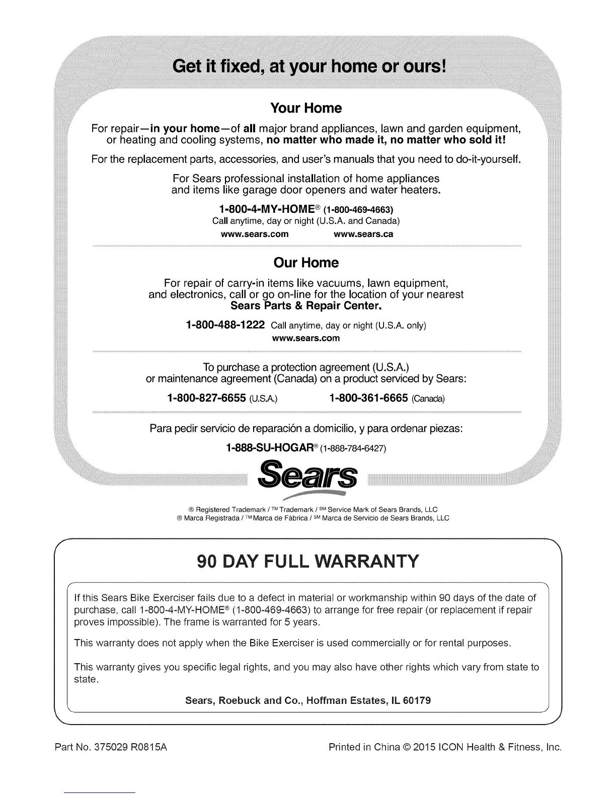 If this Sears Bike Exerciser fails due to a defect in material or workmanship within 90 days of the date of