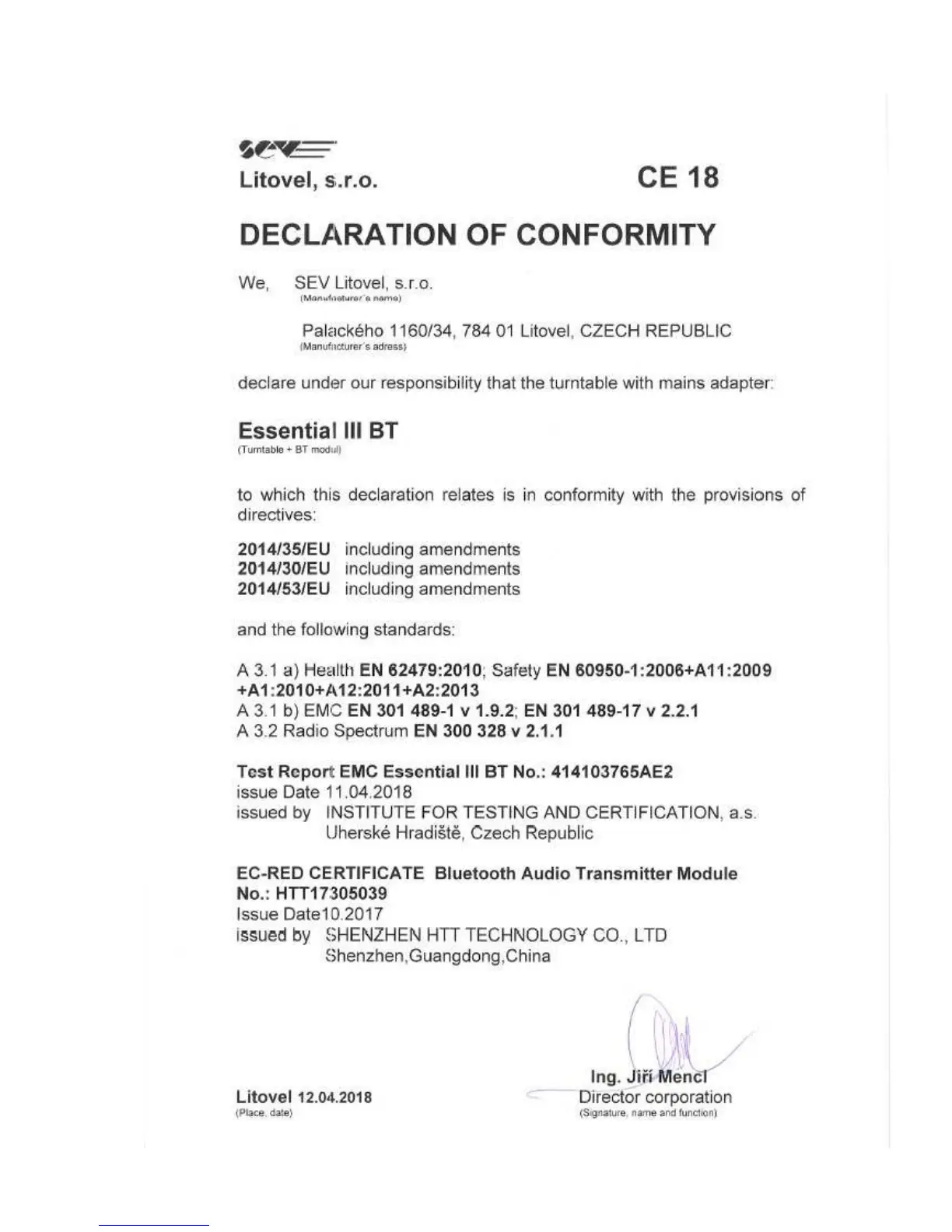 Pro-Ject Audio Systems ESSENTIAL III - Declaration of Conformity; Essential III BT Conformity; Compliance Directives; Applicable Standards