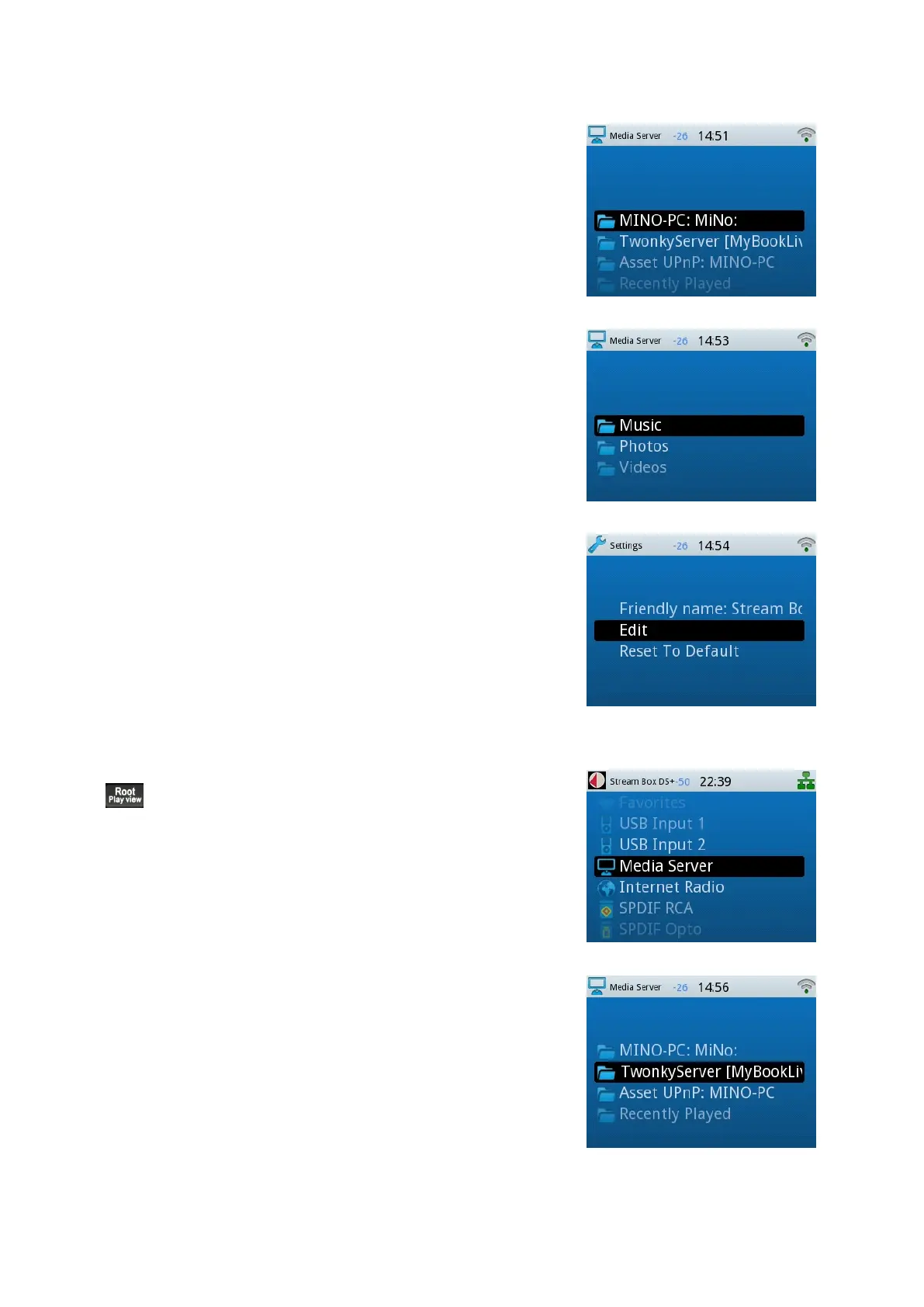 For playing music from a media server, go to the root menu with the