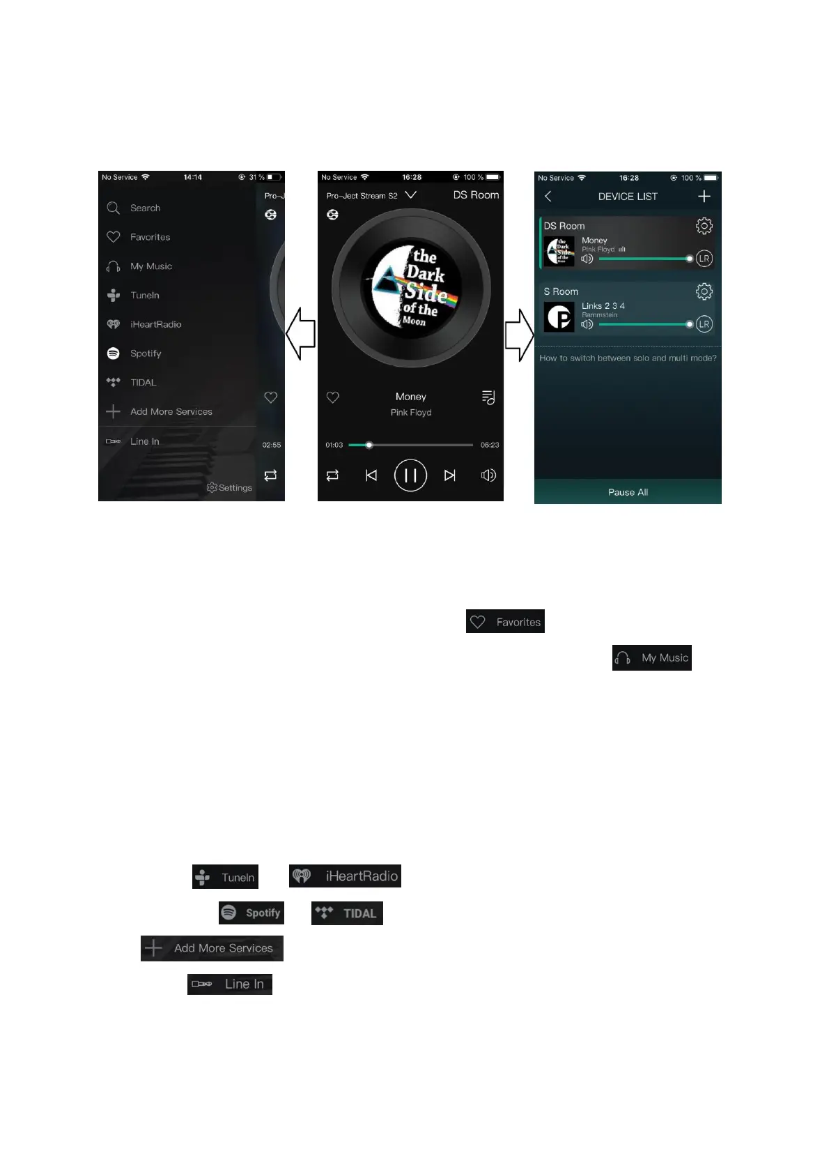 -Network and Media server, locally stored music on the mobile device and USB sources: Meine Mu
