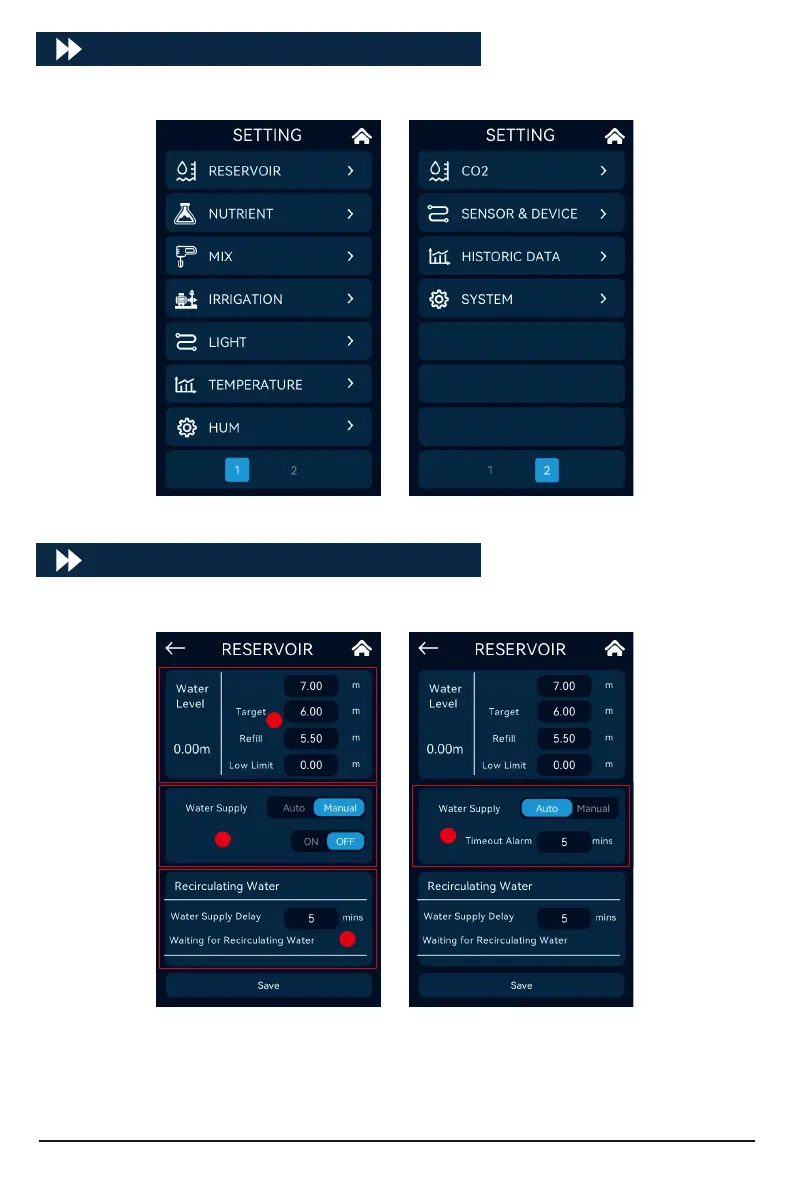 Click [RESERVOIR] to enter the water level and recirculating water settings:
