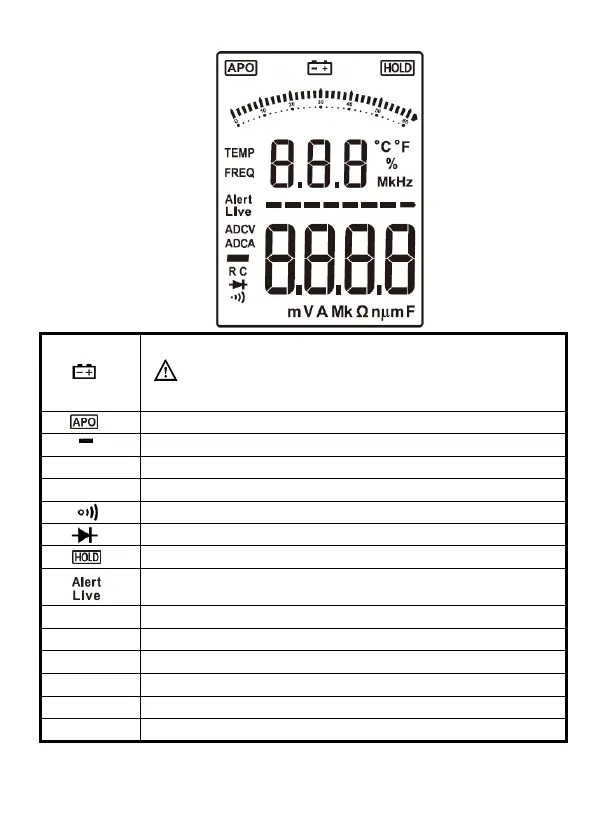 為避免錯誤的讀數而導致電擊或人身傷害本電池低壓符號顯示出