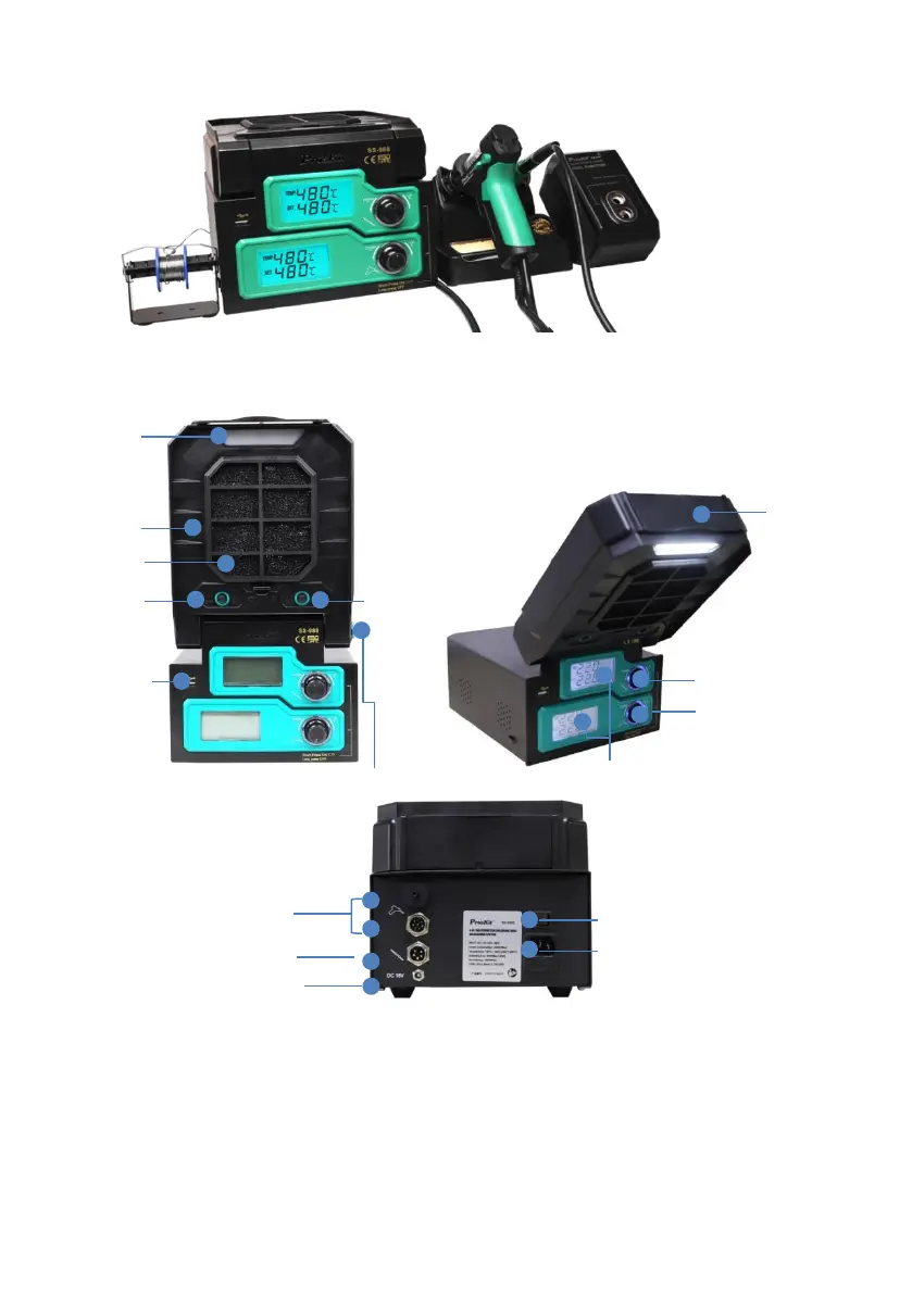 1.主机 2.烙铁 3.吸锡枪 4.排烟仪和 LED 5.烙铁头清洁器 6.锡丝架 7.烙铁架