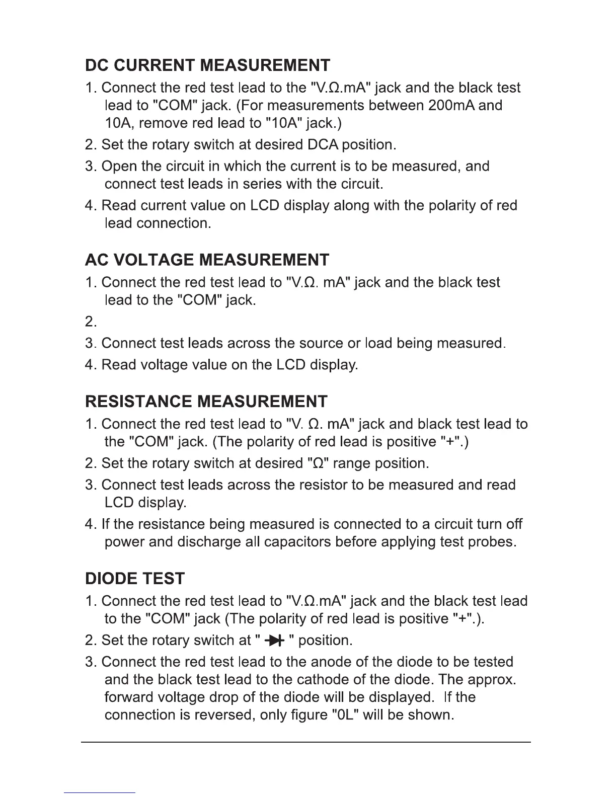 Pro'sKit MT-1210 - Operating Instructions: DC Current; Operating Instructions: AC Voltage; Operating Instructions: Resistance; Operating Instructions: Diode Test