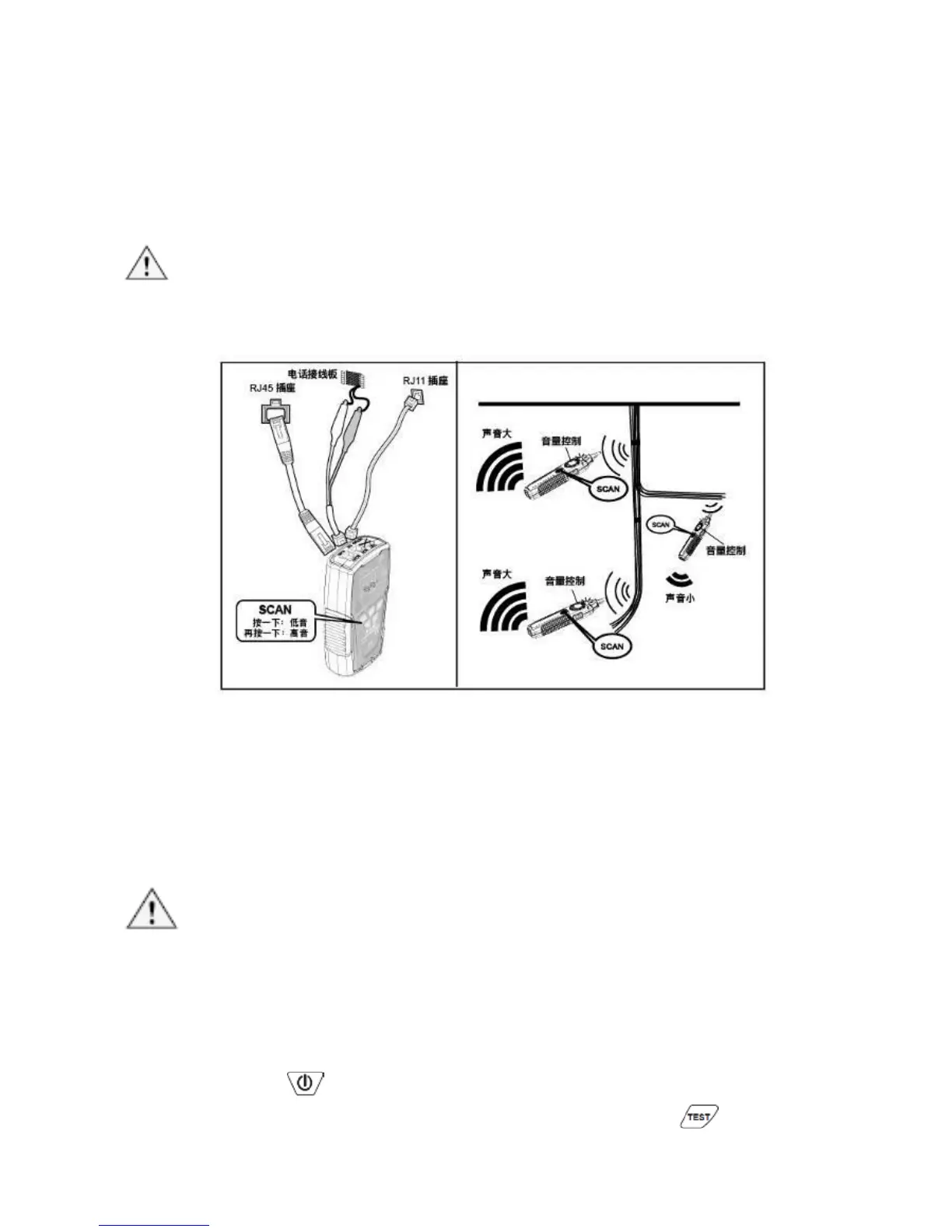 入音訊產生器的”TEST”兩用插座,不可使用RJ45 SCAN或RJ11 SCAN插座。