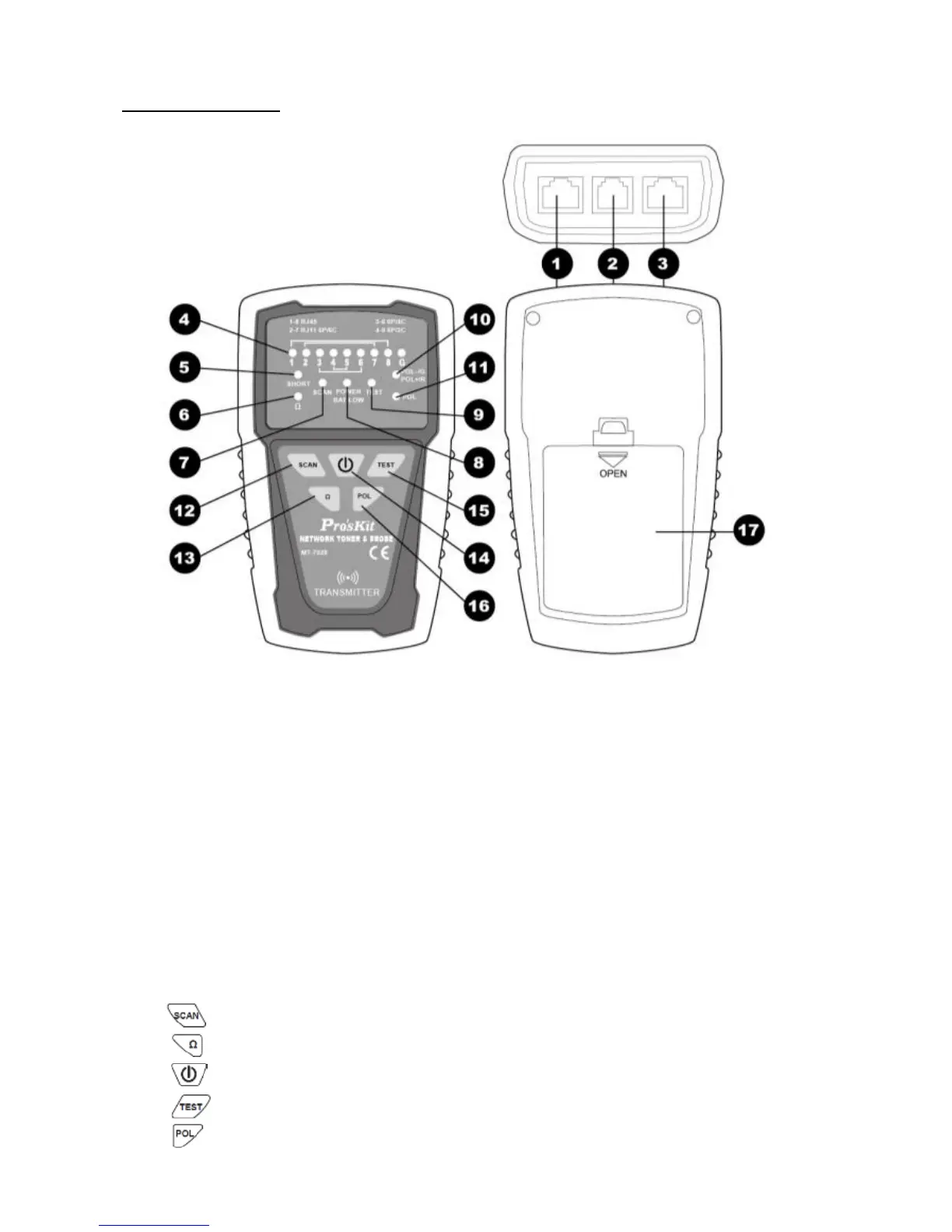 8.「POWER/BAT LOW」 Power ON/OFF & Battery low indicator 9.「TEST」