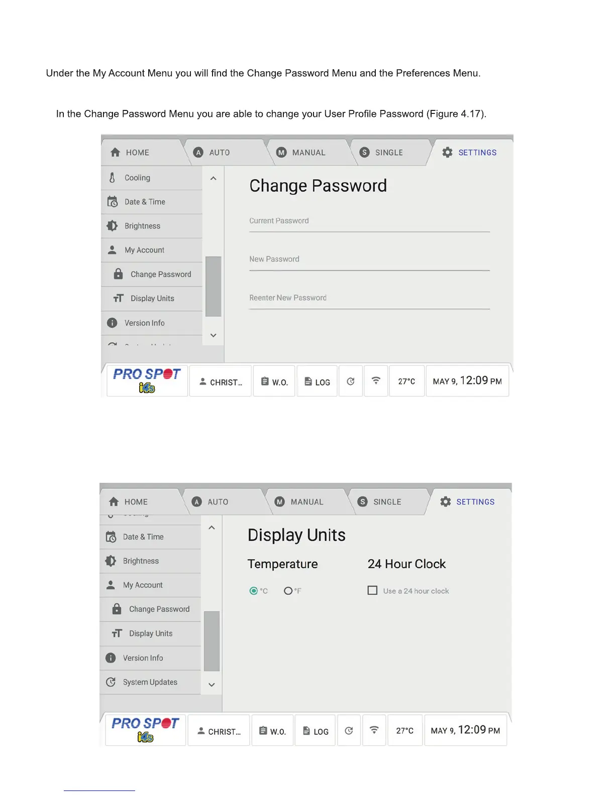 Pro Spot i4s - My Account Menu; Change Password Menu; Preferences Menu