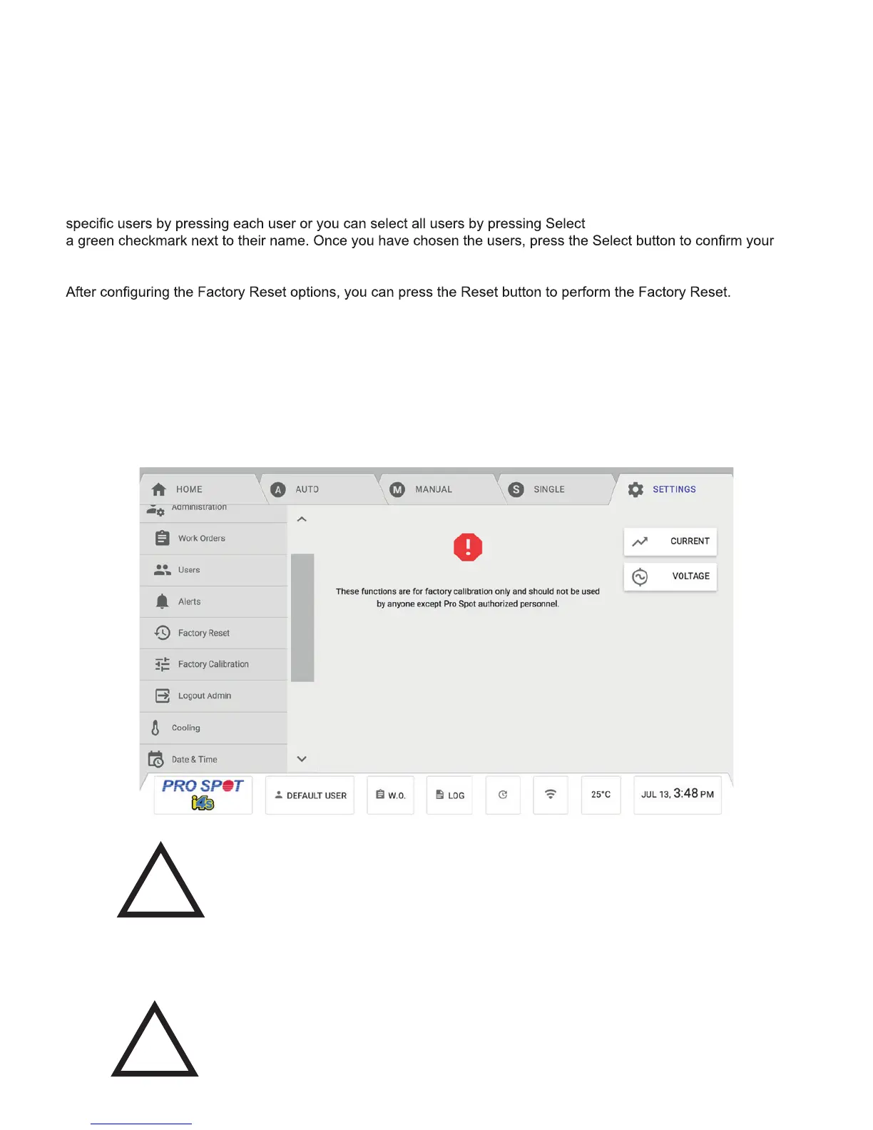 The Factory Calibration provides the ability calibrate the machine to optimal performance. This should only be per-