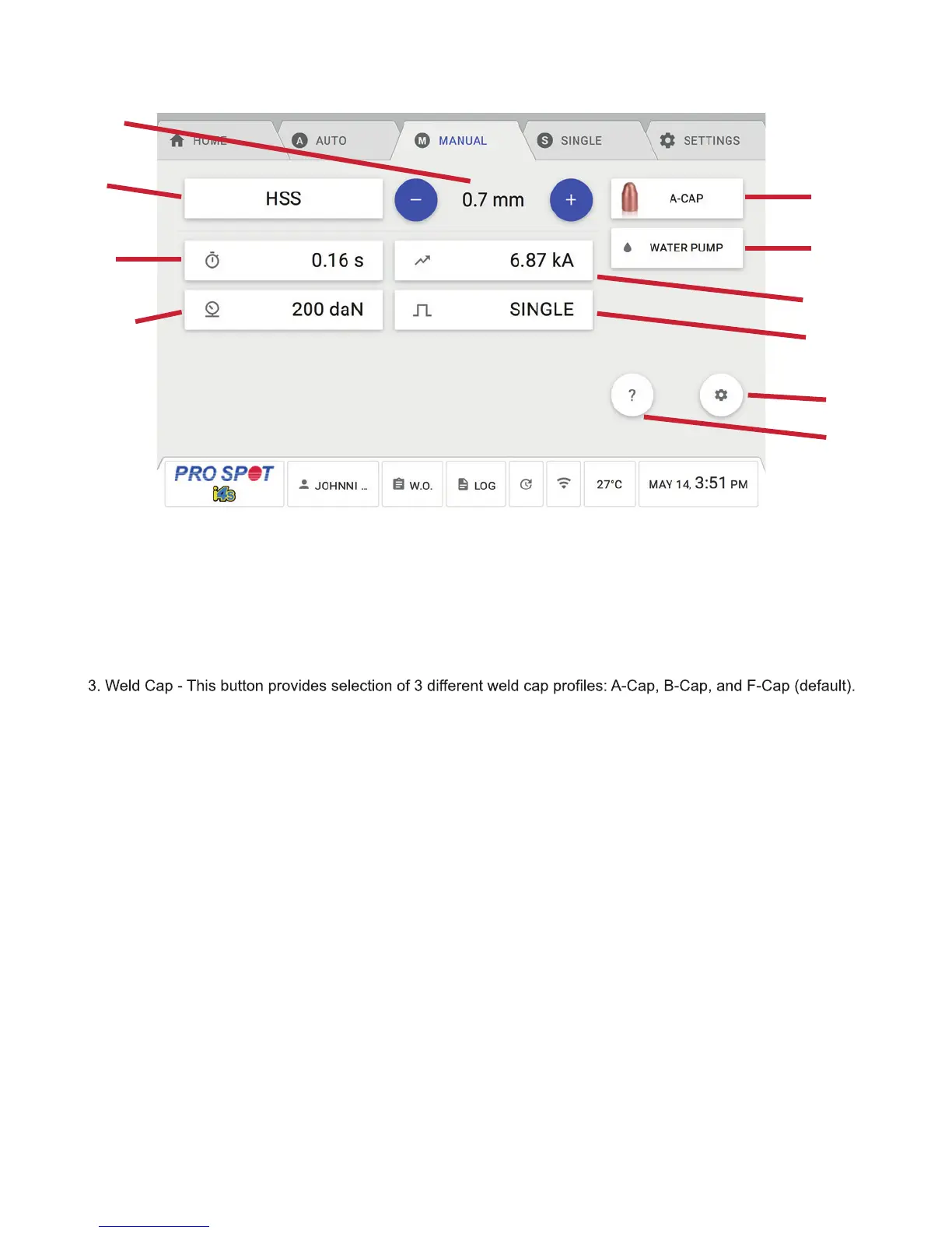 8. Weld Type - This button allows the user to change between 3 different weld types: Single, Dual, and Pulse.