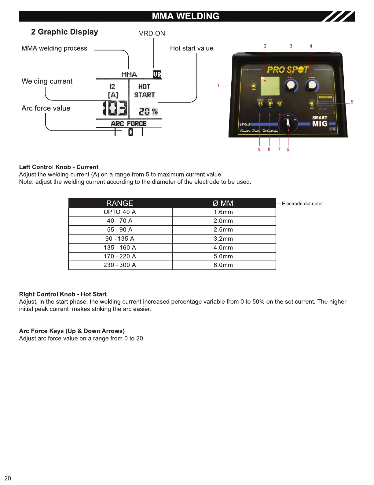 Pro Spot SP-5.3 - MMA Welding Operation; MMA Display and Controls; MMA Welding Parameters