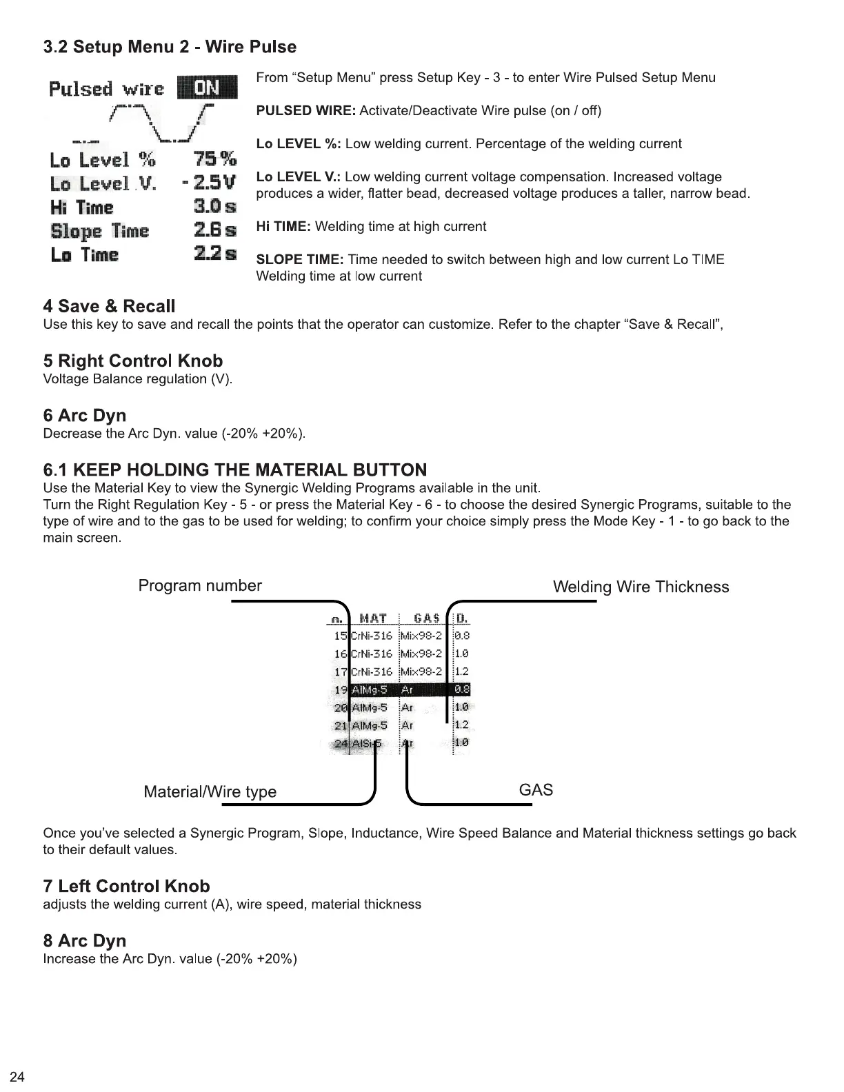Pro Spot SP-5.3 - Setup Menu 2 - Wire Pulse; Wire Pulse Settings; Wire Pulse Controls and Functions