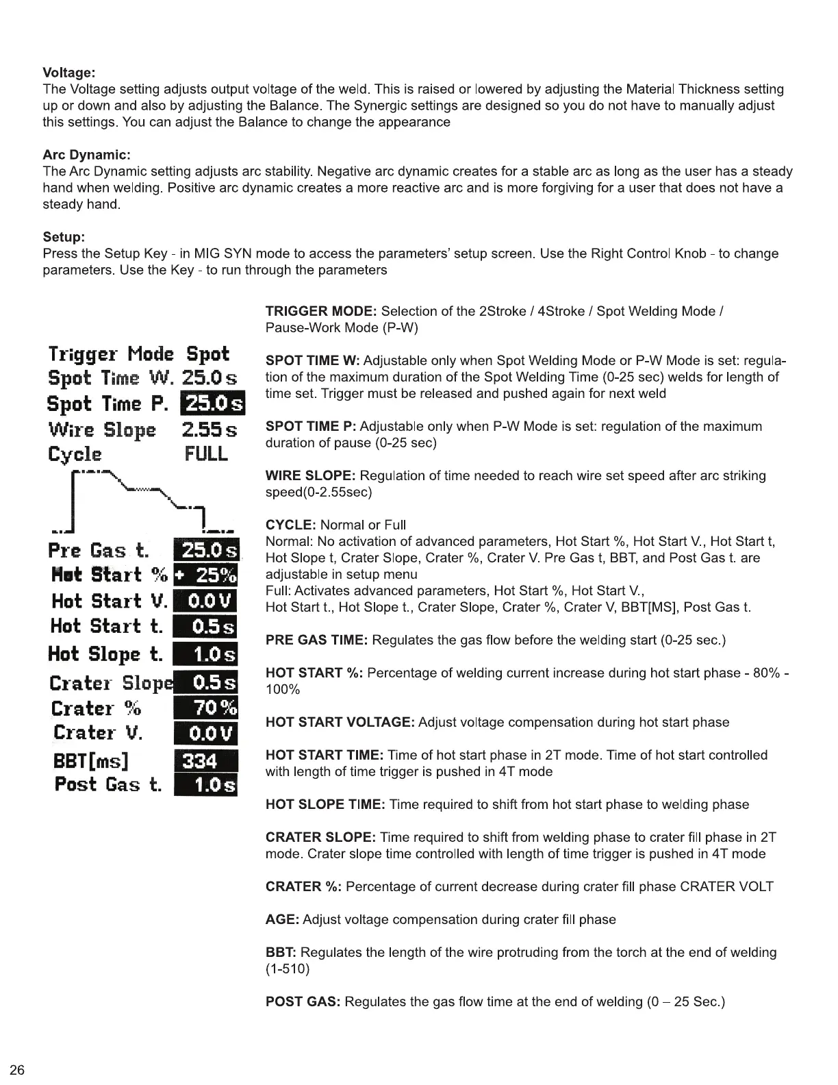 Pro Spot SP-5.3 - MIG Pulse Advanced Settings; Voltage and Arc Dynamic; Setup and Trigger Modes