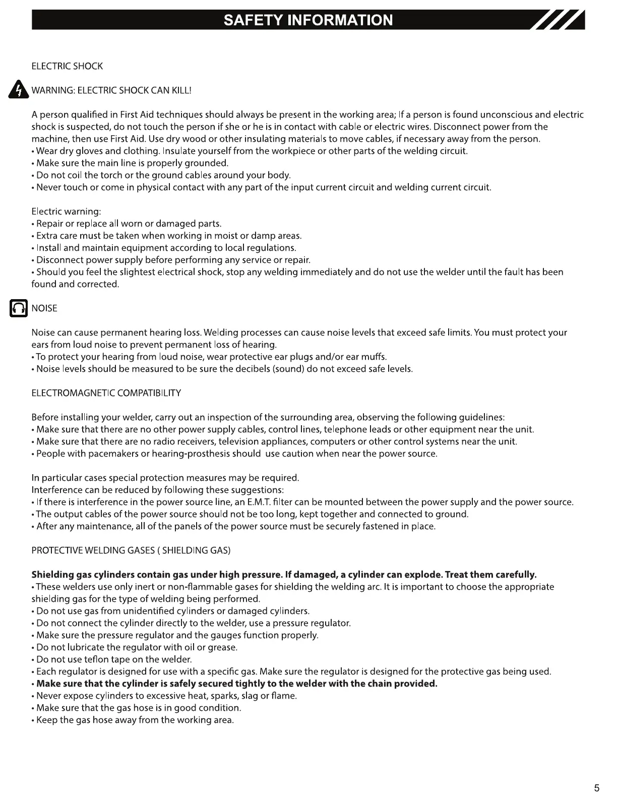 Pro Spot SP-5.3 - Electric Shock Hazards; Noise and Hearing Protection; Electromagnetic Compatibility; Shielding Gas Cylinder Safety