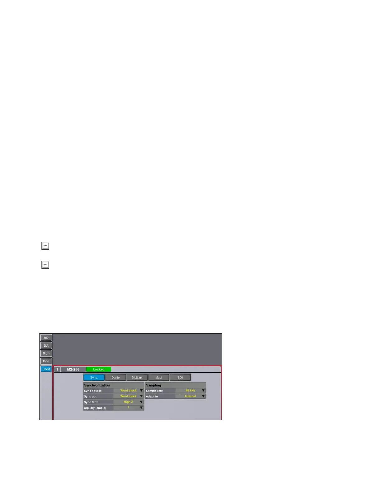 The Configuration section is divided into subsections, such as Sync, Dante, DigiLink, Madi, and SDI.