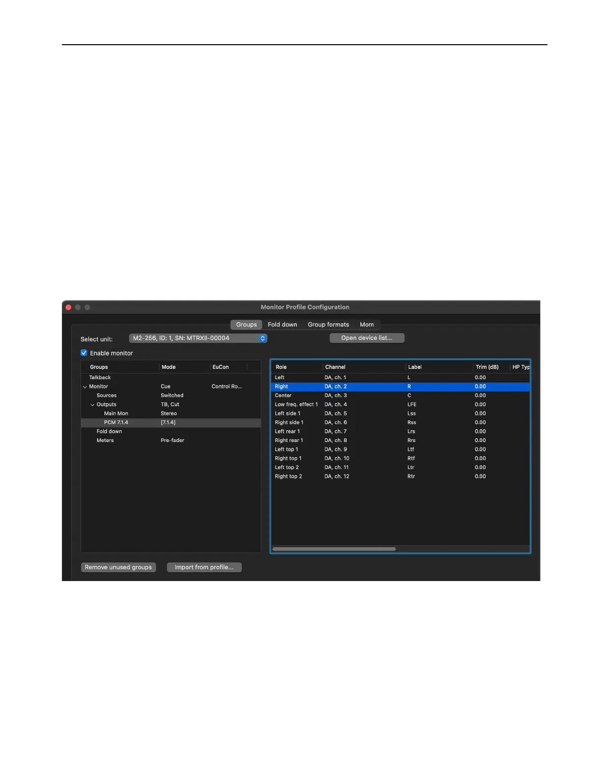 The Groups page of the Monitor Profile Configuration window lets you create and edit monitor and cue configurations for MTRX II.