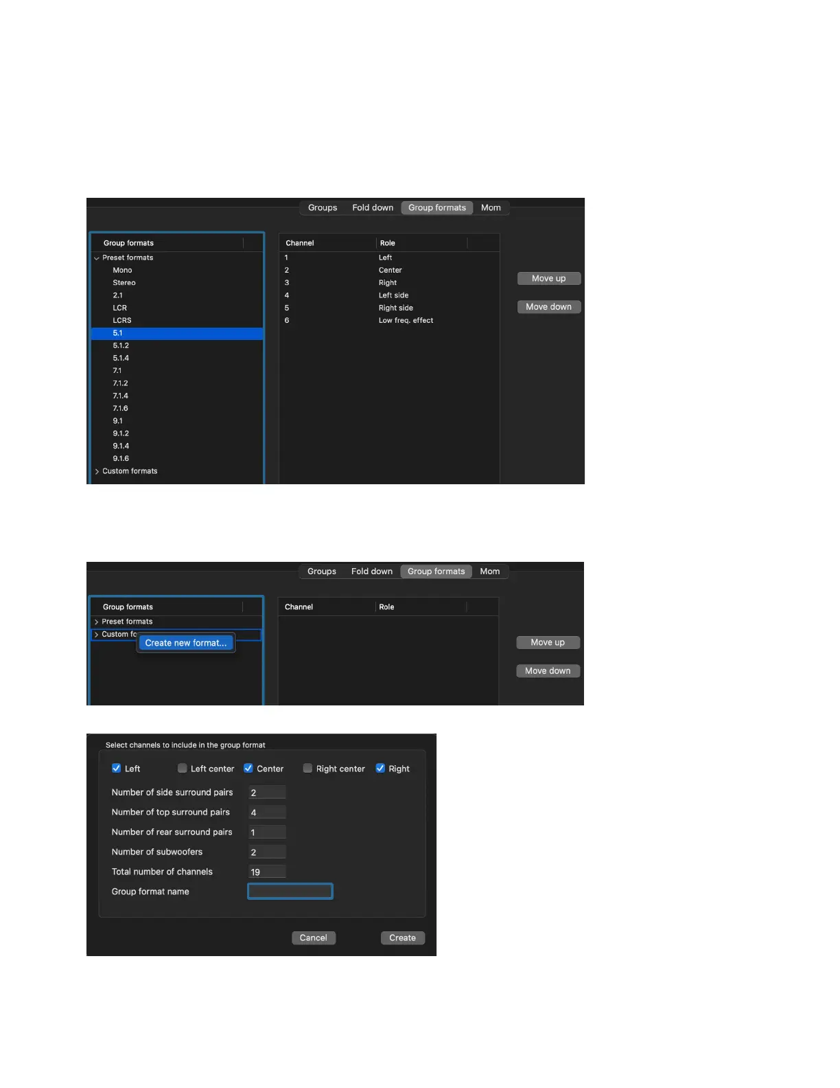 mats. In the Custom formats editor, group formats using the well-defined role tags can be created, thus making almost any speaker map-