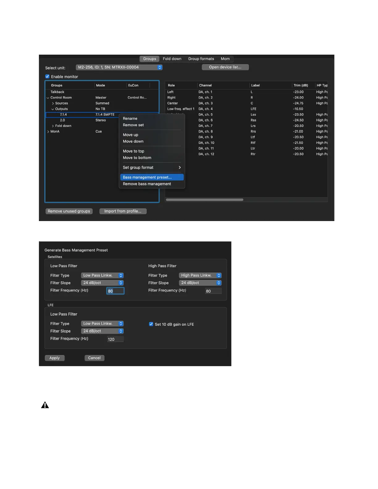 Bass Management preset an editing window appears as shown in the following picture.