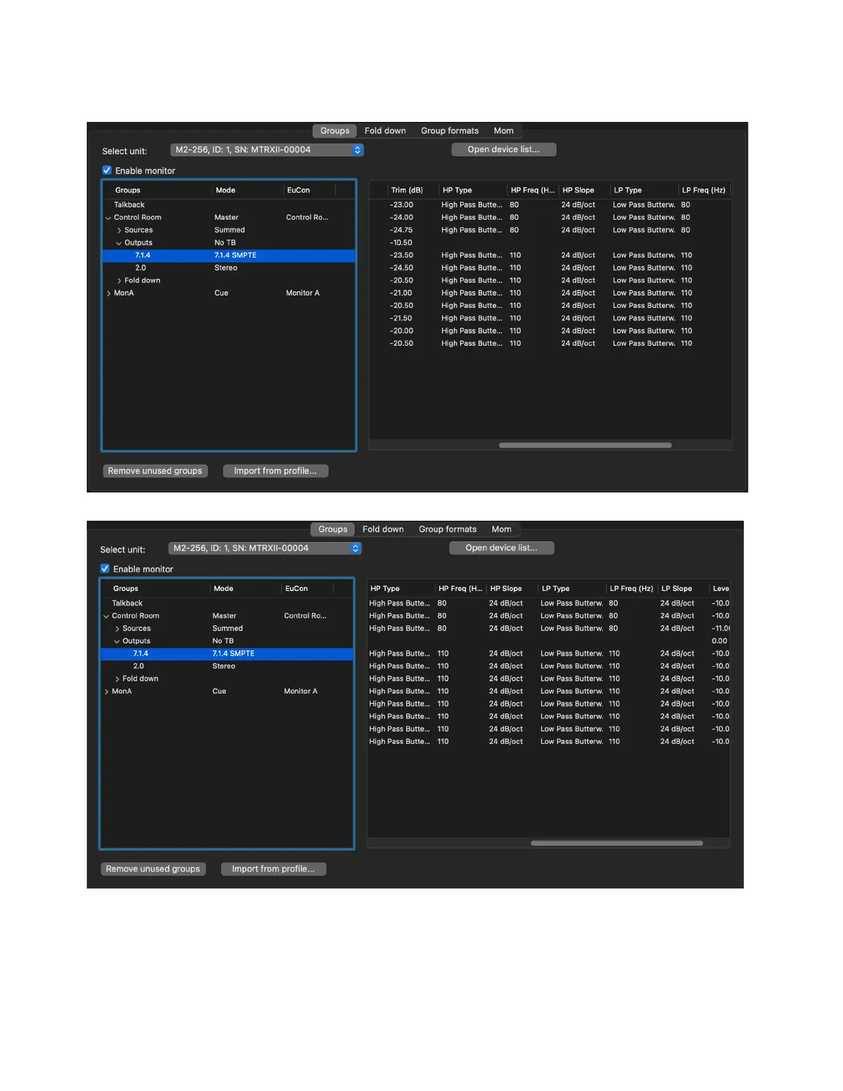 When the Bass Management preset have been applied to the output set it can be viewed and further edited in the monitor profile window