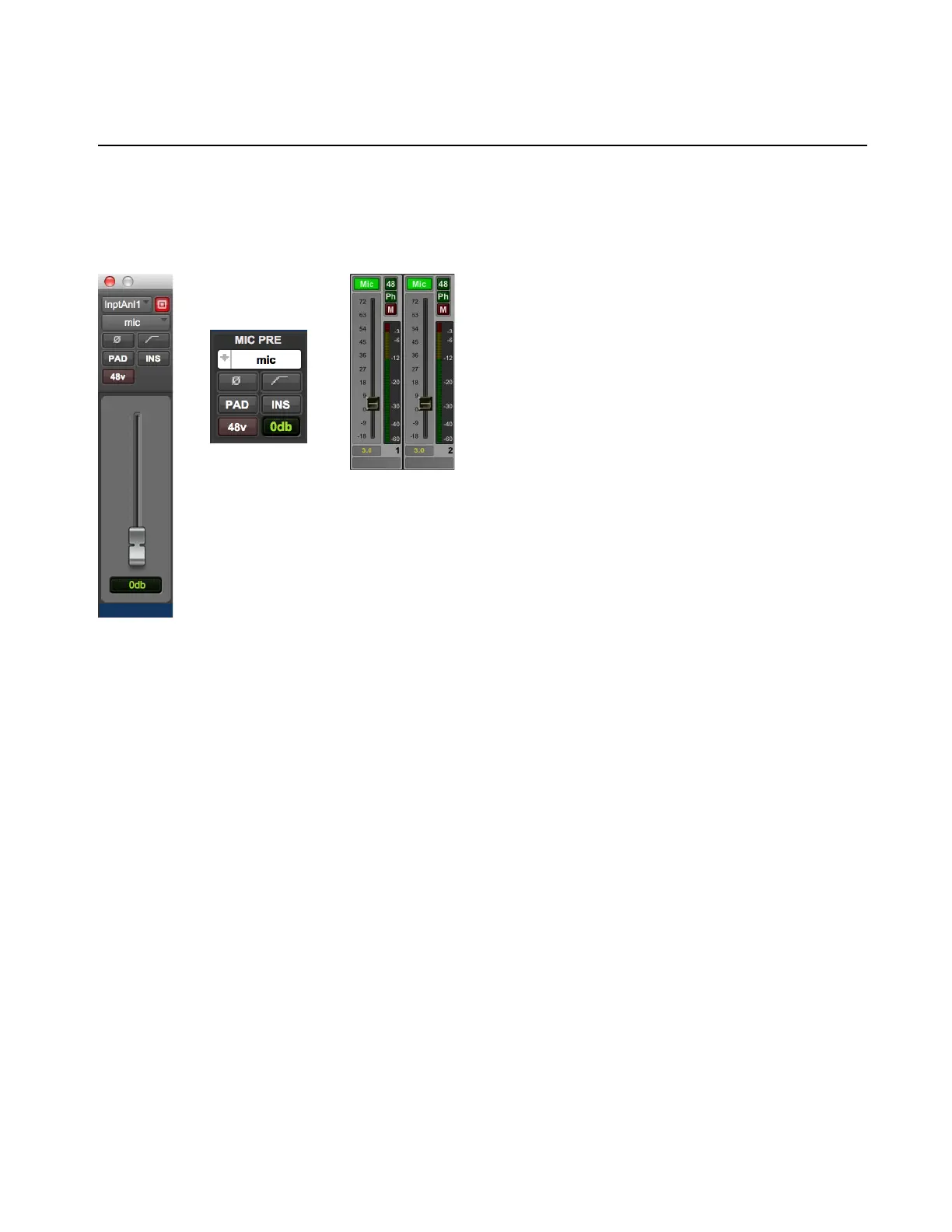 Pro Tools Mic Pre window (left), Pro Tools Mic Pre view (middle), and DADman Channel strip (right)