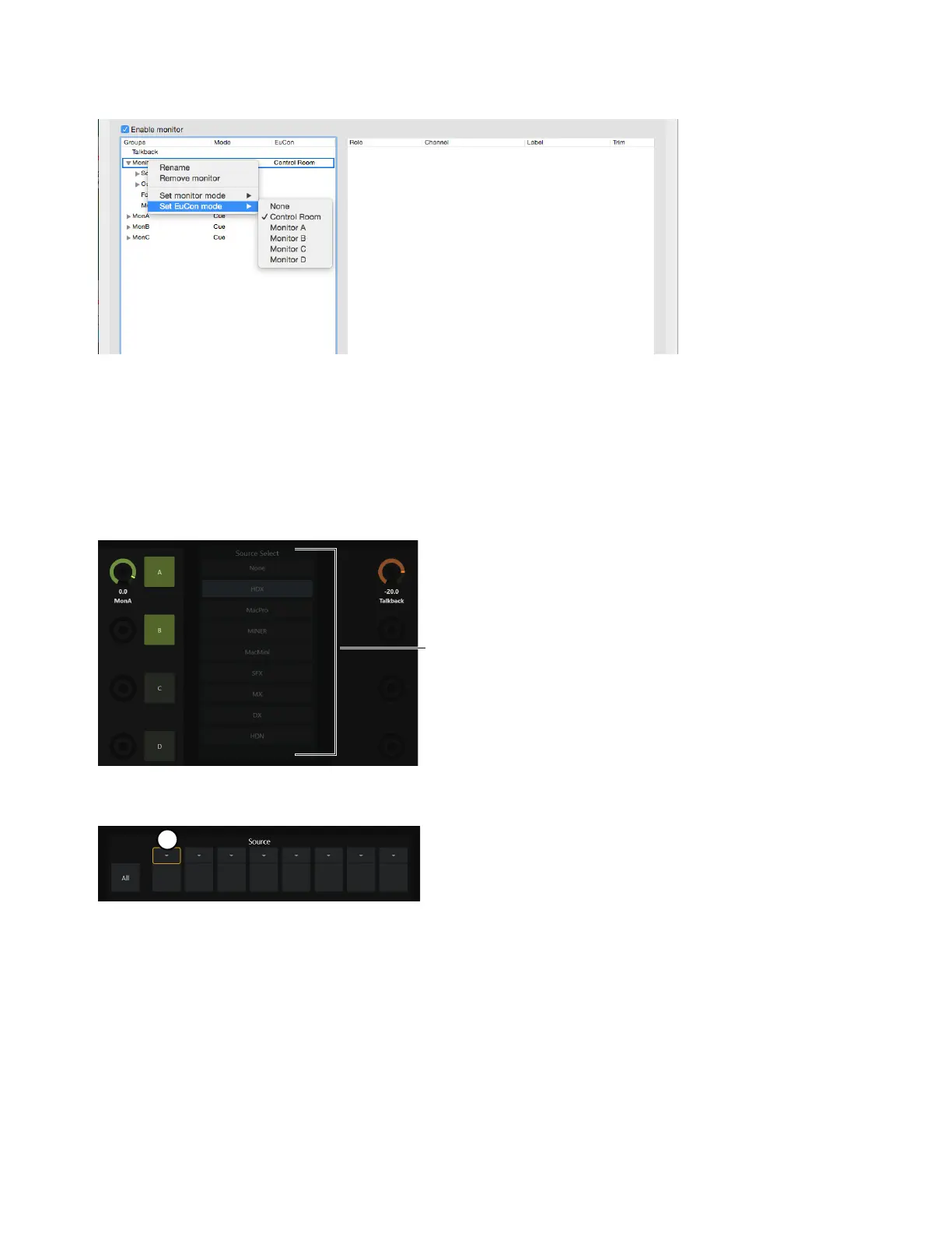 4 Right-click on any monitor in the profile and assign the EUCON mode to what you want to define as Control Room, Monitor A, Mon-