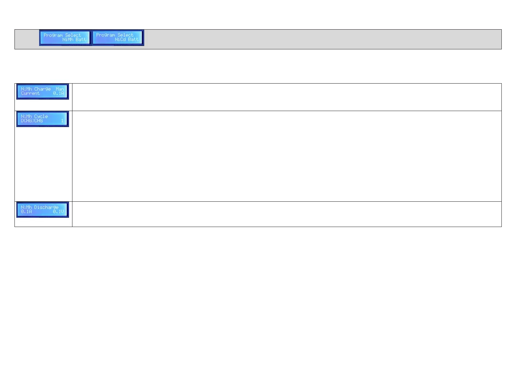 CeparagraphemontredesécransaveclafonctionNiMh.LaprocédureestlamêmepourlafonctionNiCd.