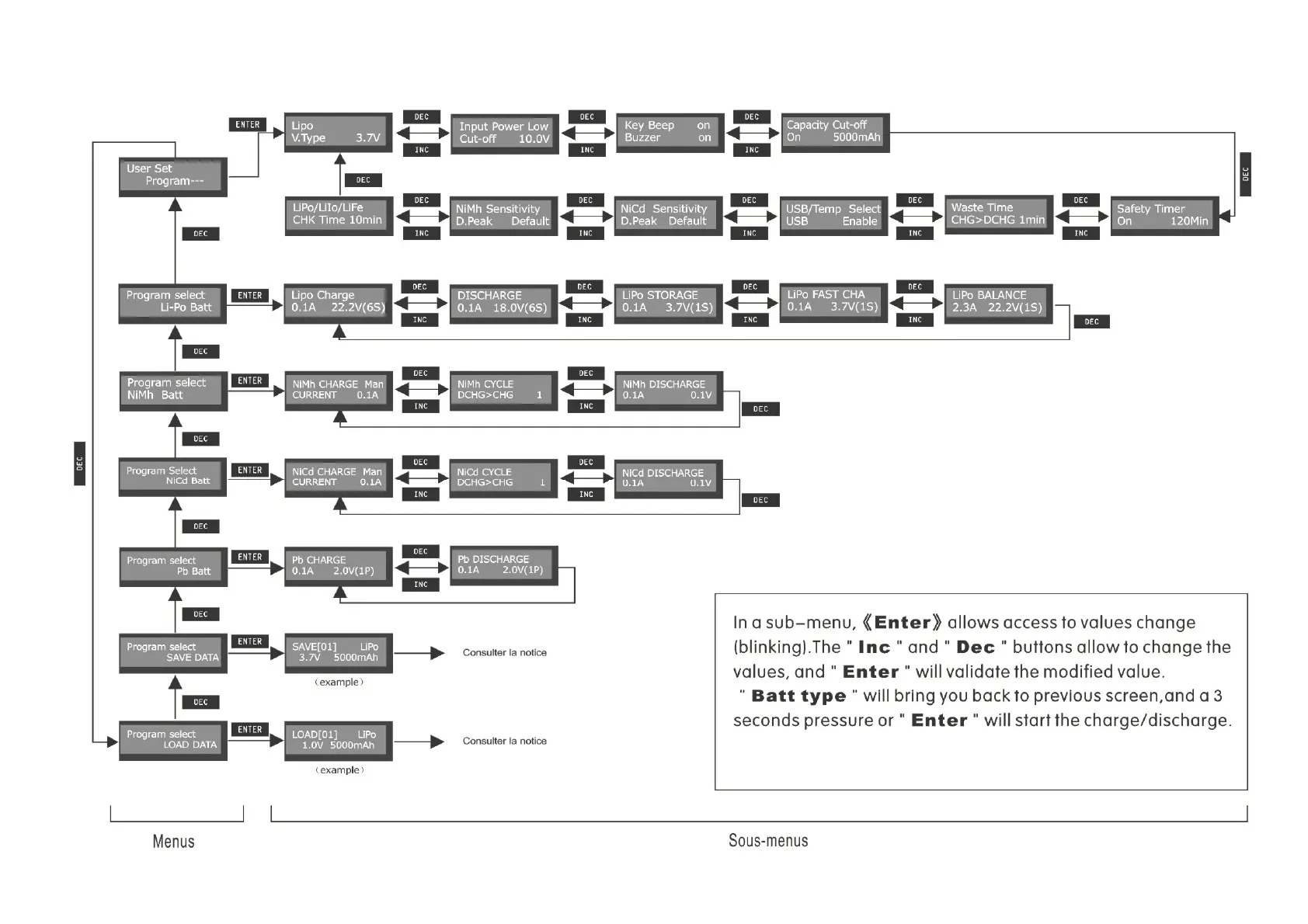 Pro-Tronik AP680BLC - Menu Navigation and Program Selection; User Set Program Configuration; Lithium Battery Program Options; NiMh;NiCd Battery Program Options