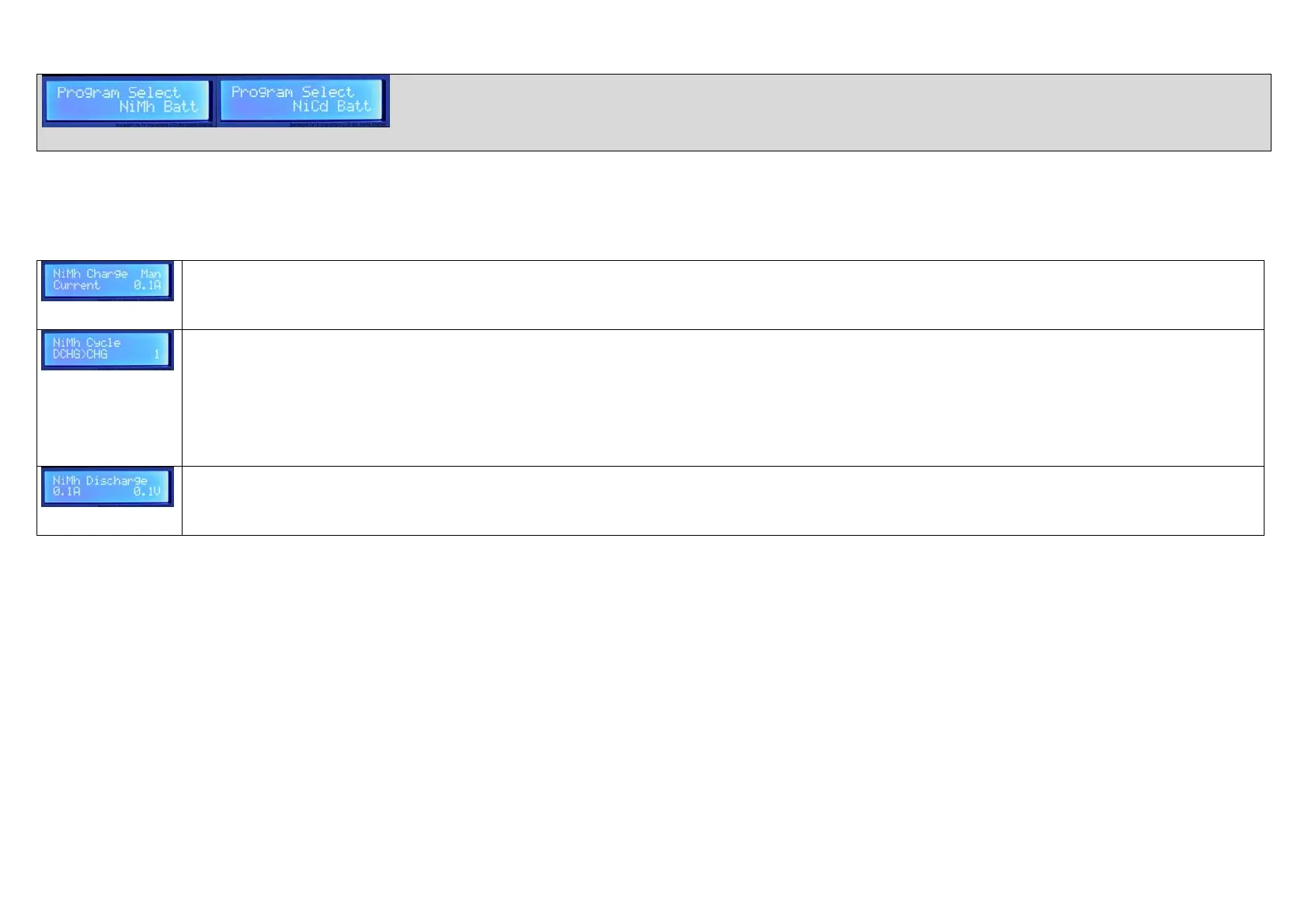 valuesaredifferentfollowingtheprogramyouchoose.Pleasemakesuretoattachthematchingbatteries(Ni‐MhorNi‐Cd)whenusingoneor
