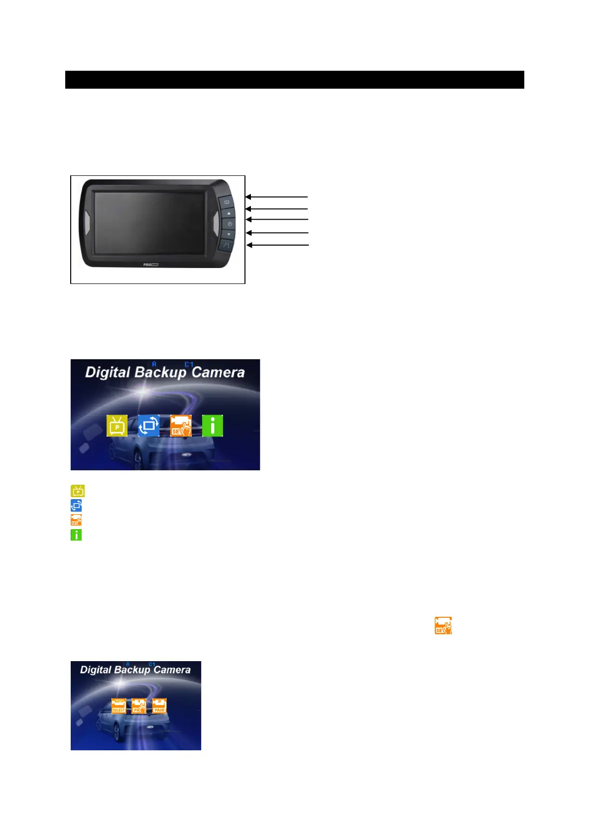 Om de diverse instellingen uit te voeren zijn op het beeldscherm vijf bedieningsknoppen