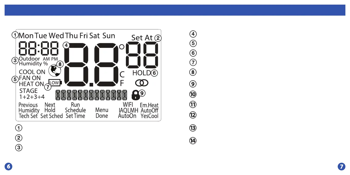 Hold Indicator: Displayed when the thermostat is inpermanent hold
