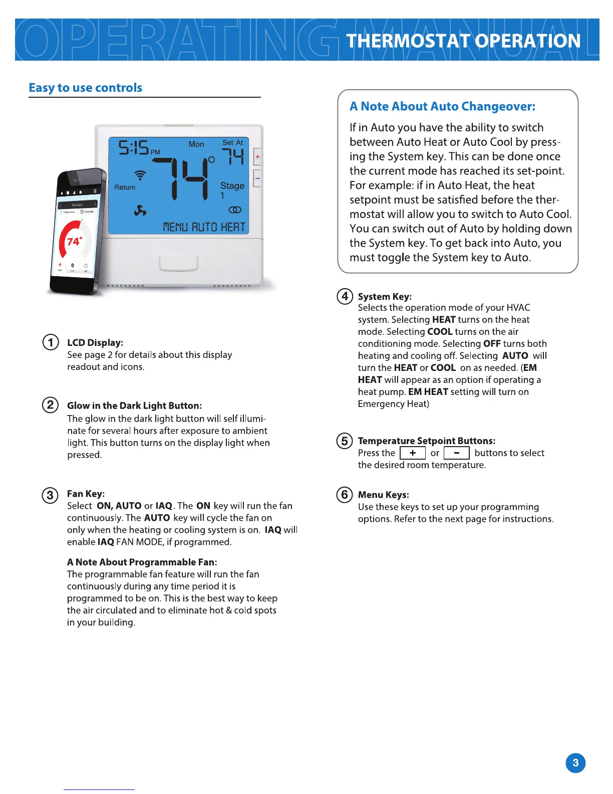 Pro1 Technologies T855i - Thermostat Operation; Thermostat Controls; Operational Notes