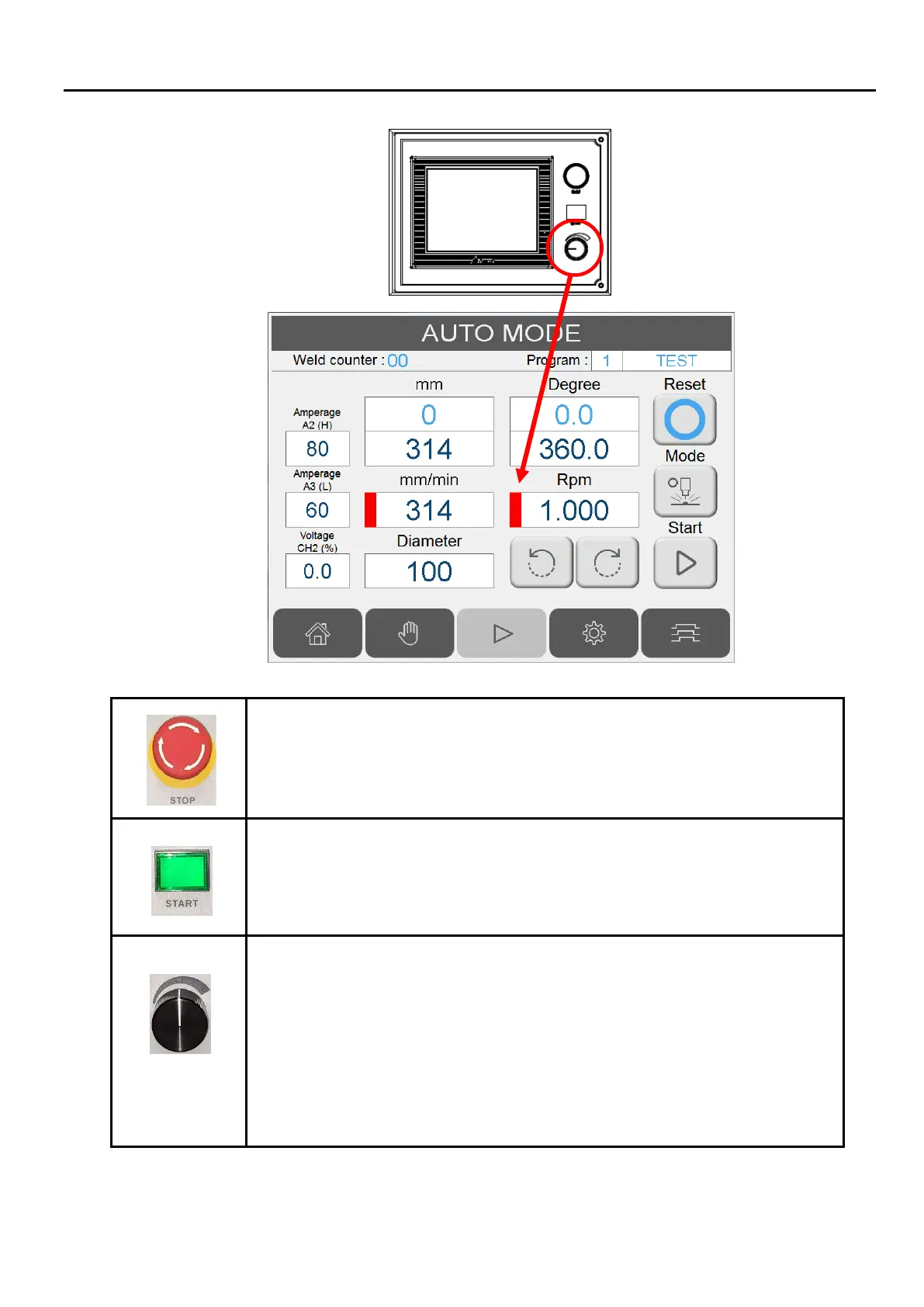 Rpm and mm/min. Rotate the knob to modify speed.