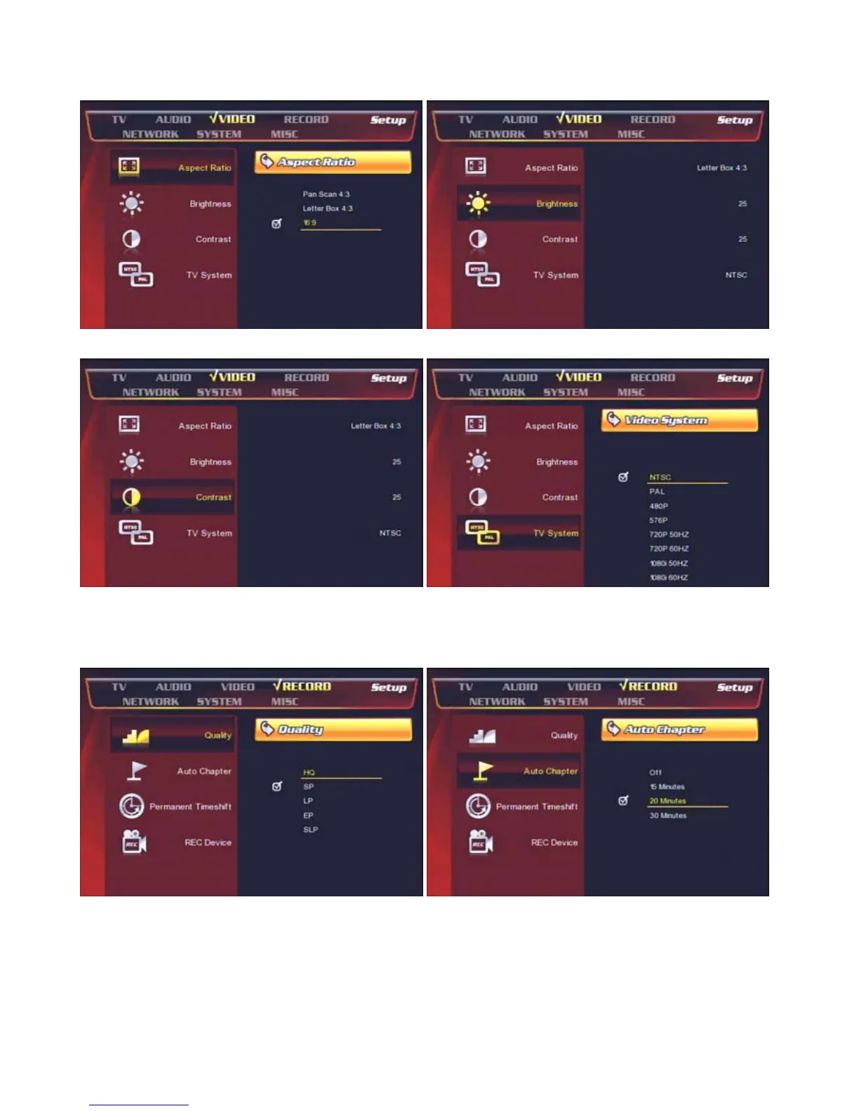 [Contrast] : Adjust the contrast [TV System] : Select a proper TV-Out