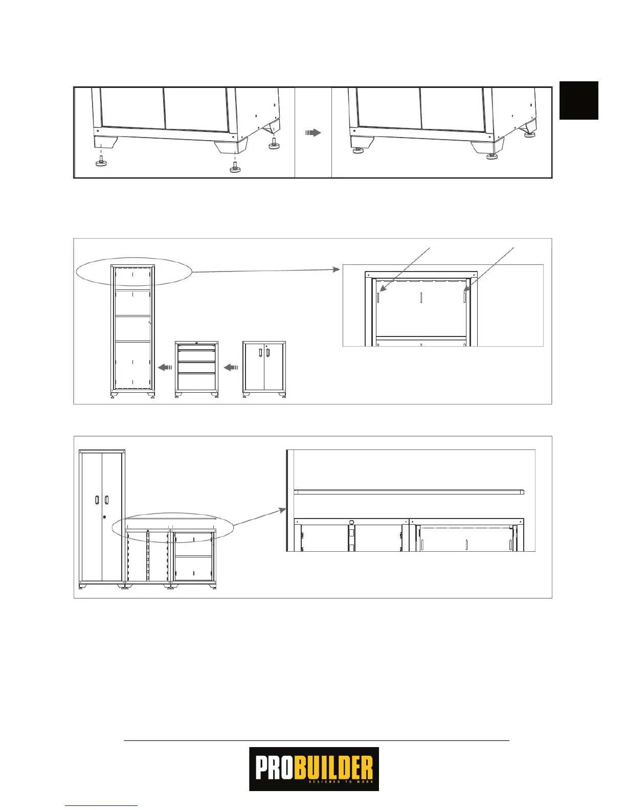 Juster om nødvendig føttene slik at skapene står i vater og ikke vipper.