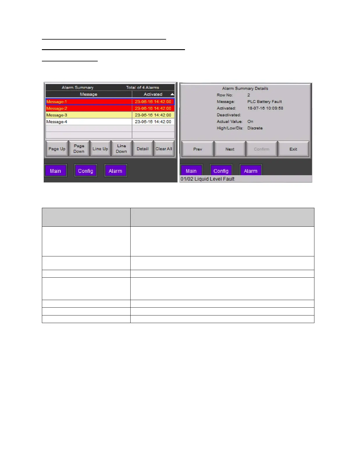 The ALARM SUMMARY will appear when the ALM. LOG button on the MAIN MENU is pressed. The