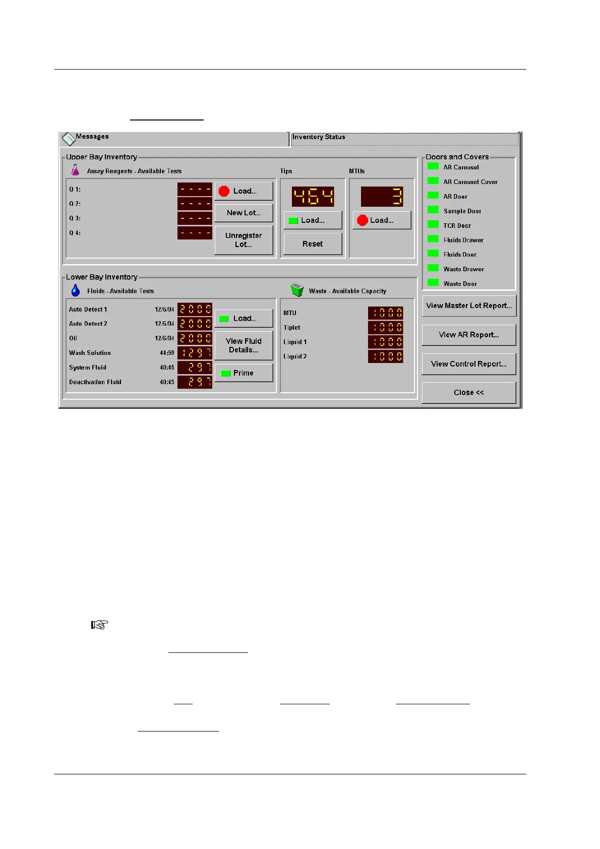 Use the Inventory Status screen to manage reagents, fluids, consumables, and waste.