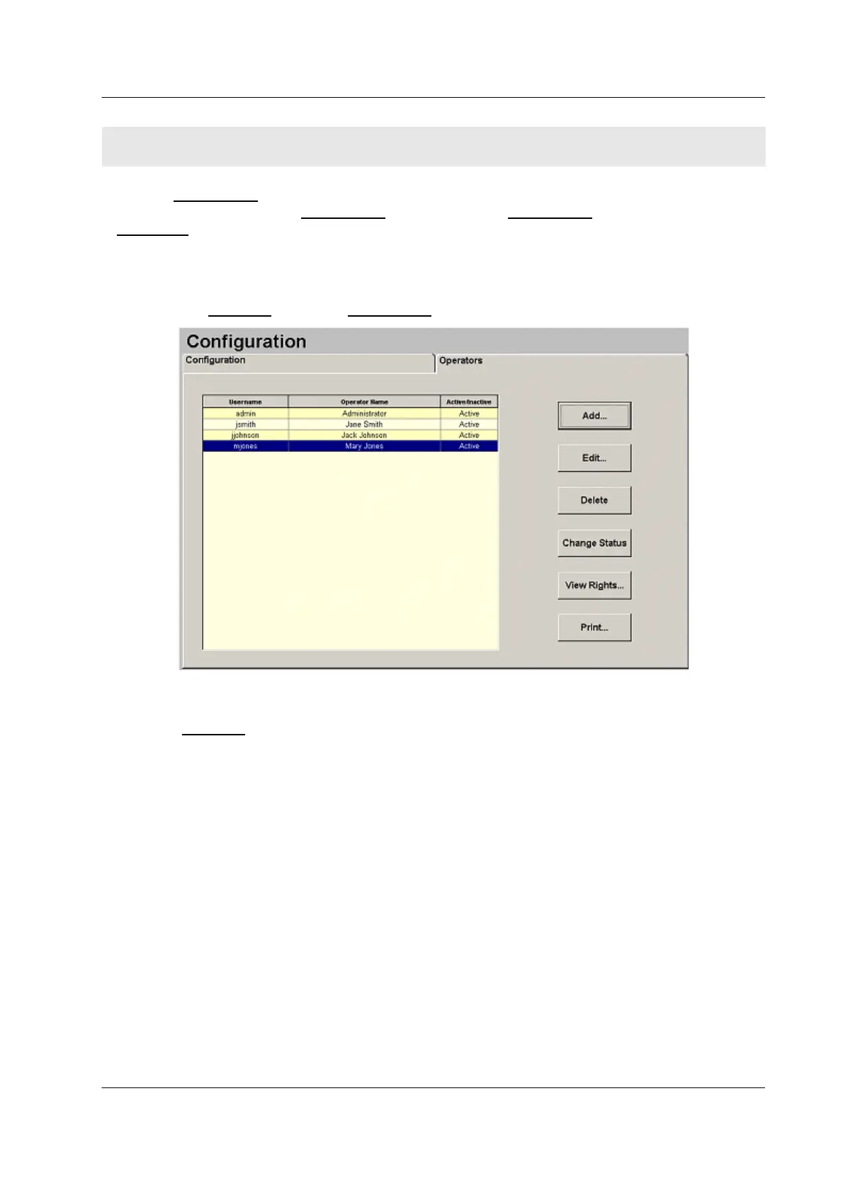 Use the Operators tab on the Configuration screen to add, edit, and delete operator accounts.