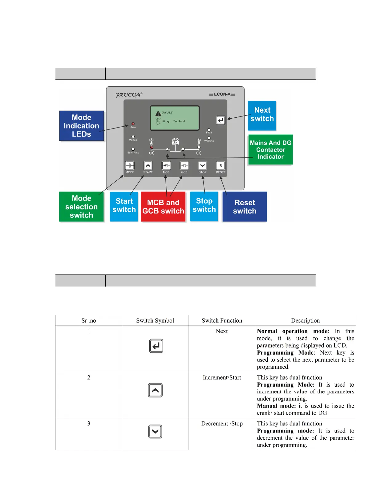 ECON-A has 7 switches provided on its front panel. The table below describes the operation of these.