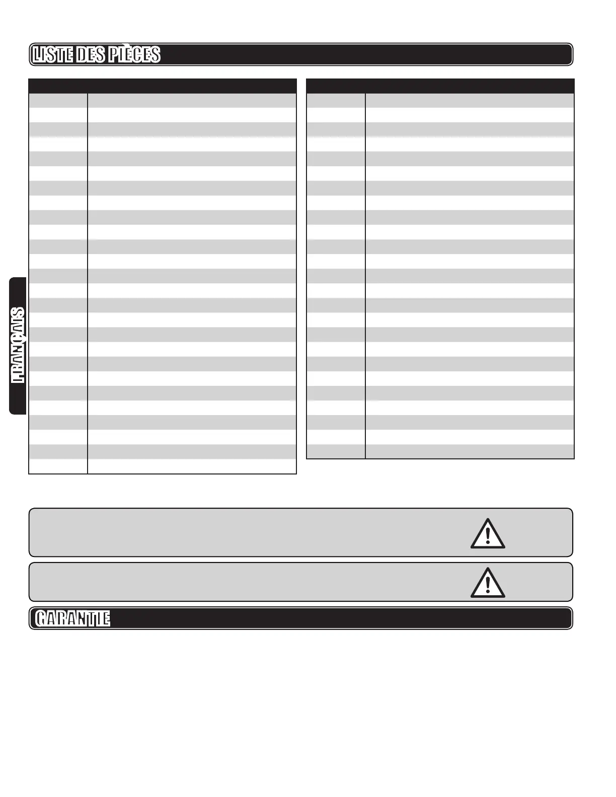 Cette garantie ne s’applique pas aux pièces qui doivent être remplacées périodiquement, telles que les lames d’entraînement