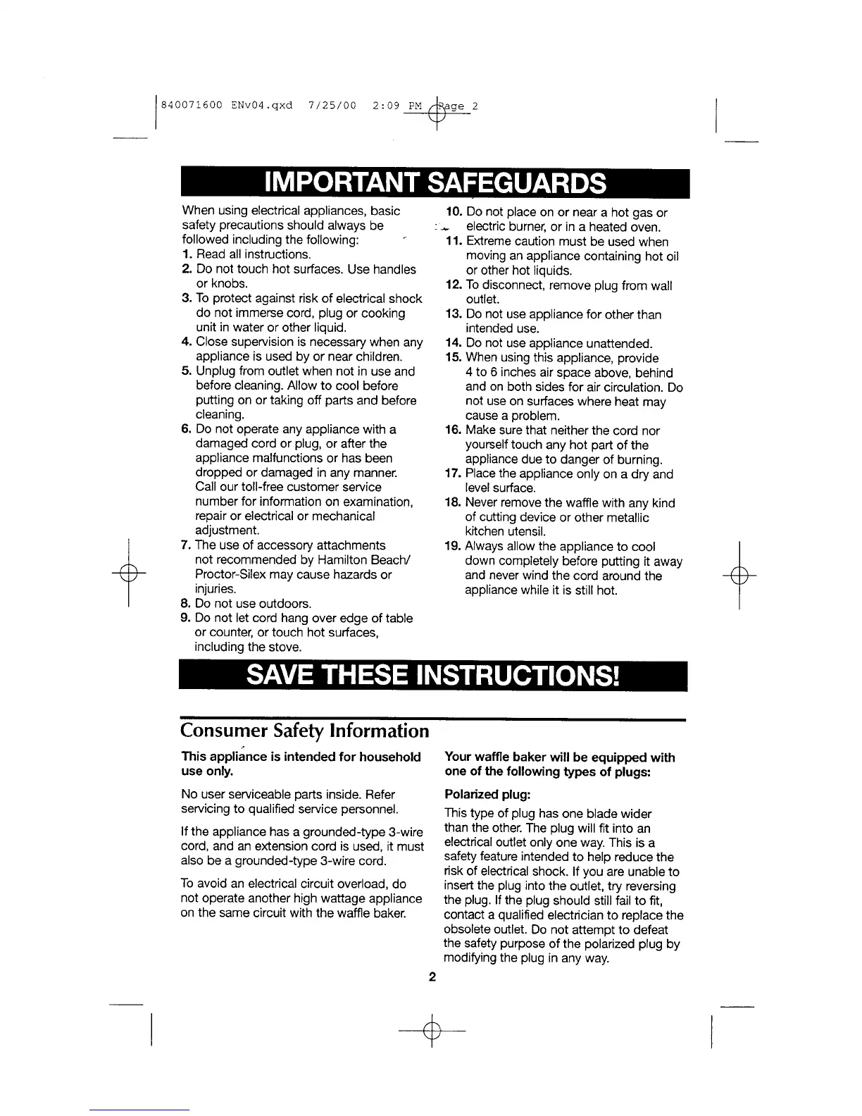 Proctor-Silex 26000 - Important Safeguards; Consumer Safety Information; Polarized Plug