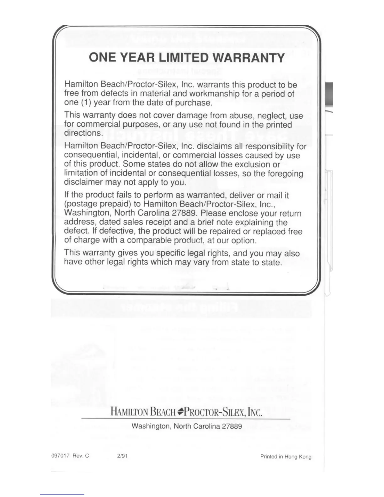 Proctor-Silex E1131 - One Year Limited Warranty