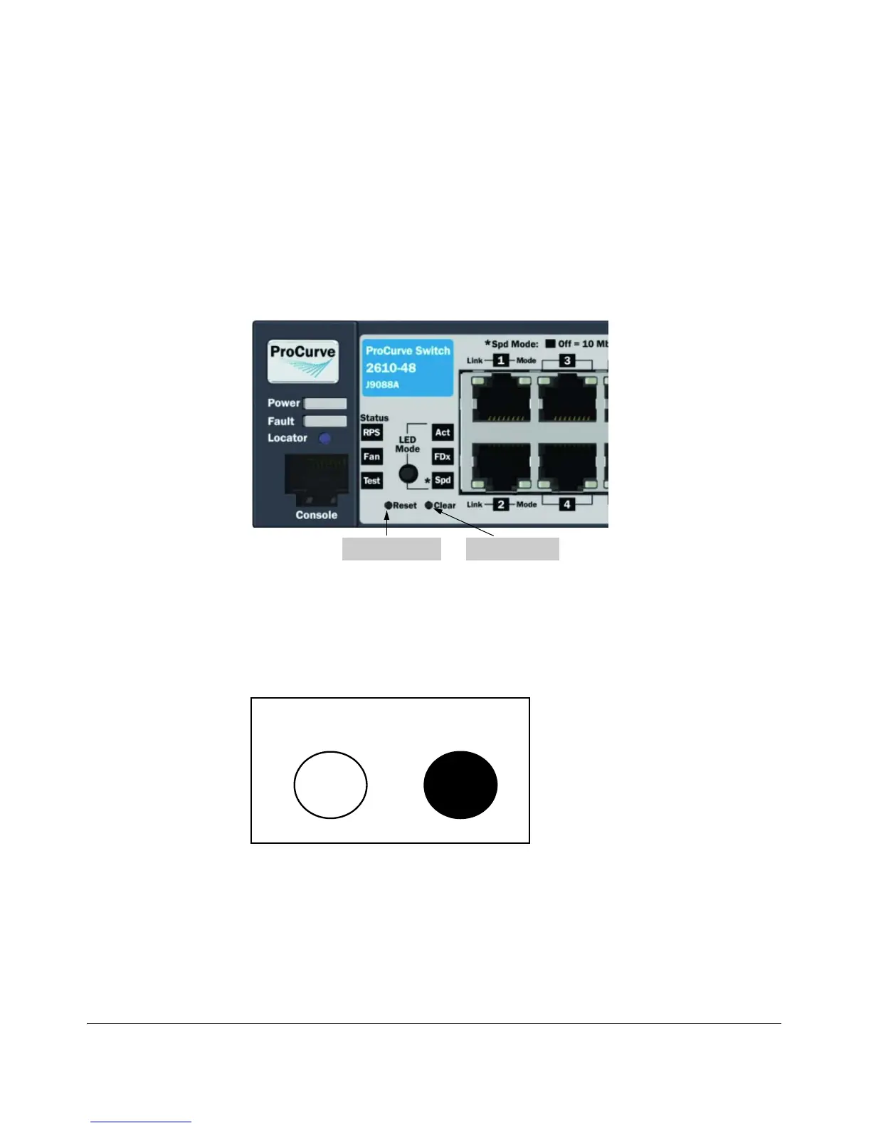 The front panel of the switch includes the Reset button and the Clear button.
