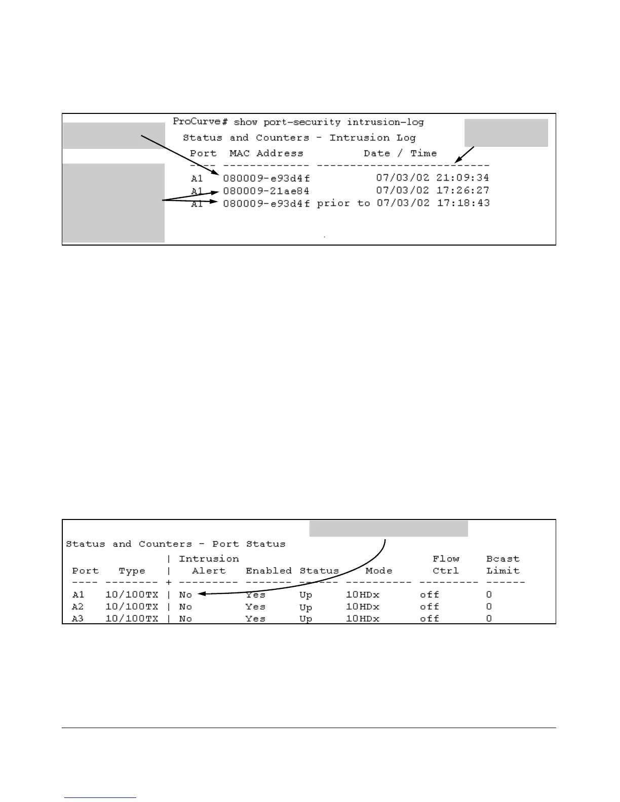 ProCurve(config)# port-security a1 clear-intrusion-flag