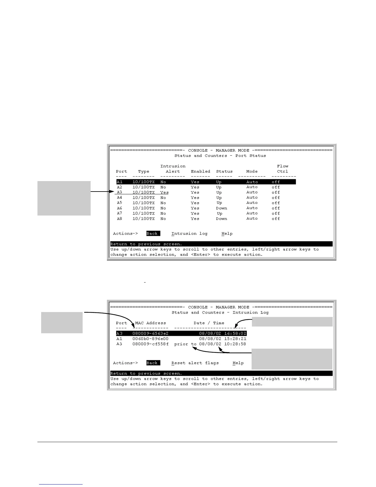 Figure 10-13. Example of Port Status Screen with Intrusion Alert on Port A3