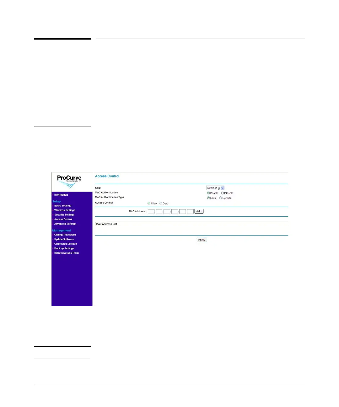 There are two options for setting up access control on the wireless network:
