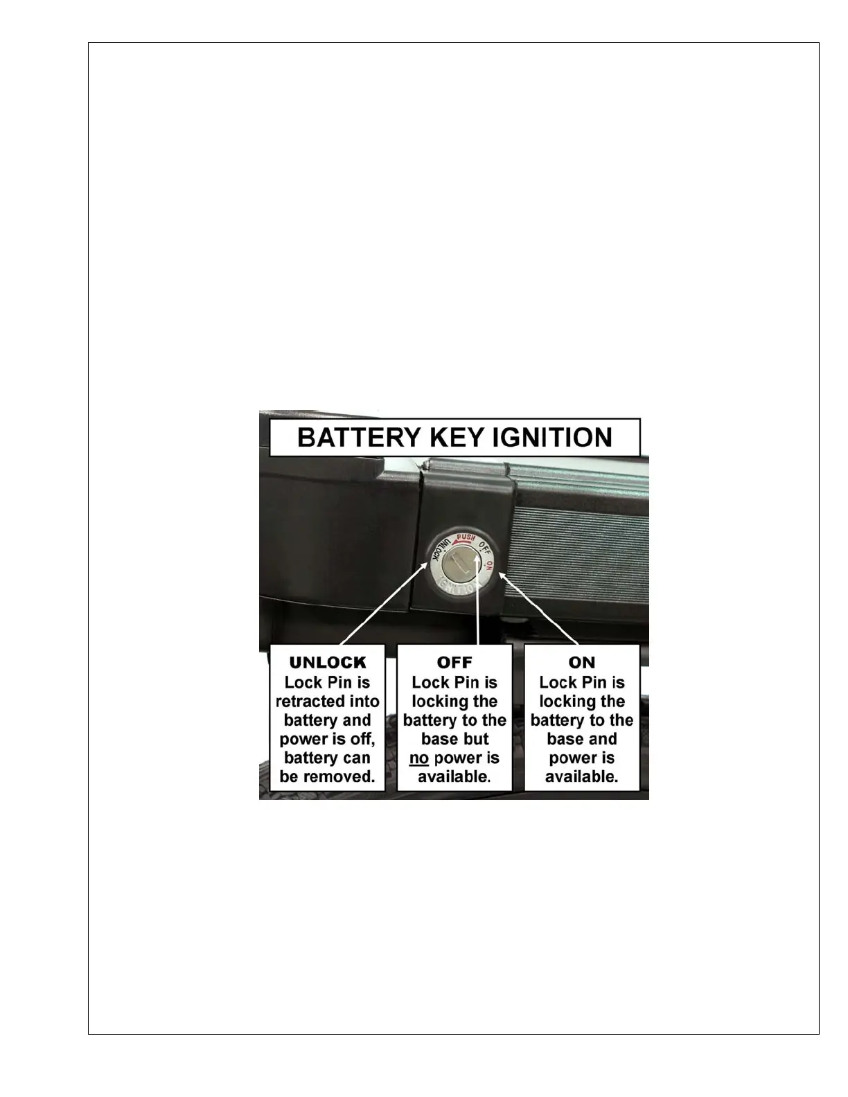 The battery will latch in place and the key can be removed in the battery base ignition when the key is in the “OFF”