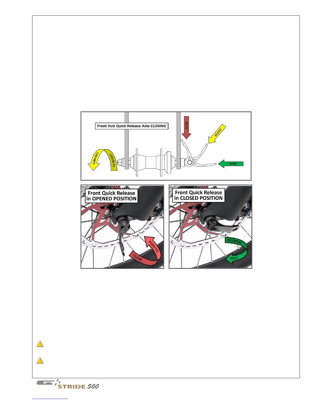 The front wheel on the Stride 500 can be removed or installed without tools. A quick release skewer through a hollow axle is