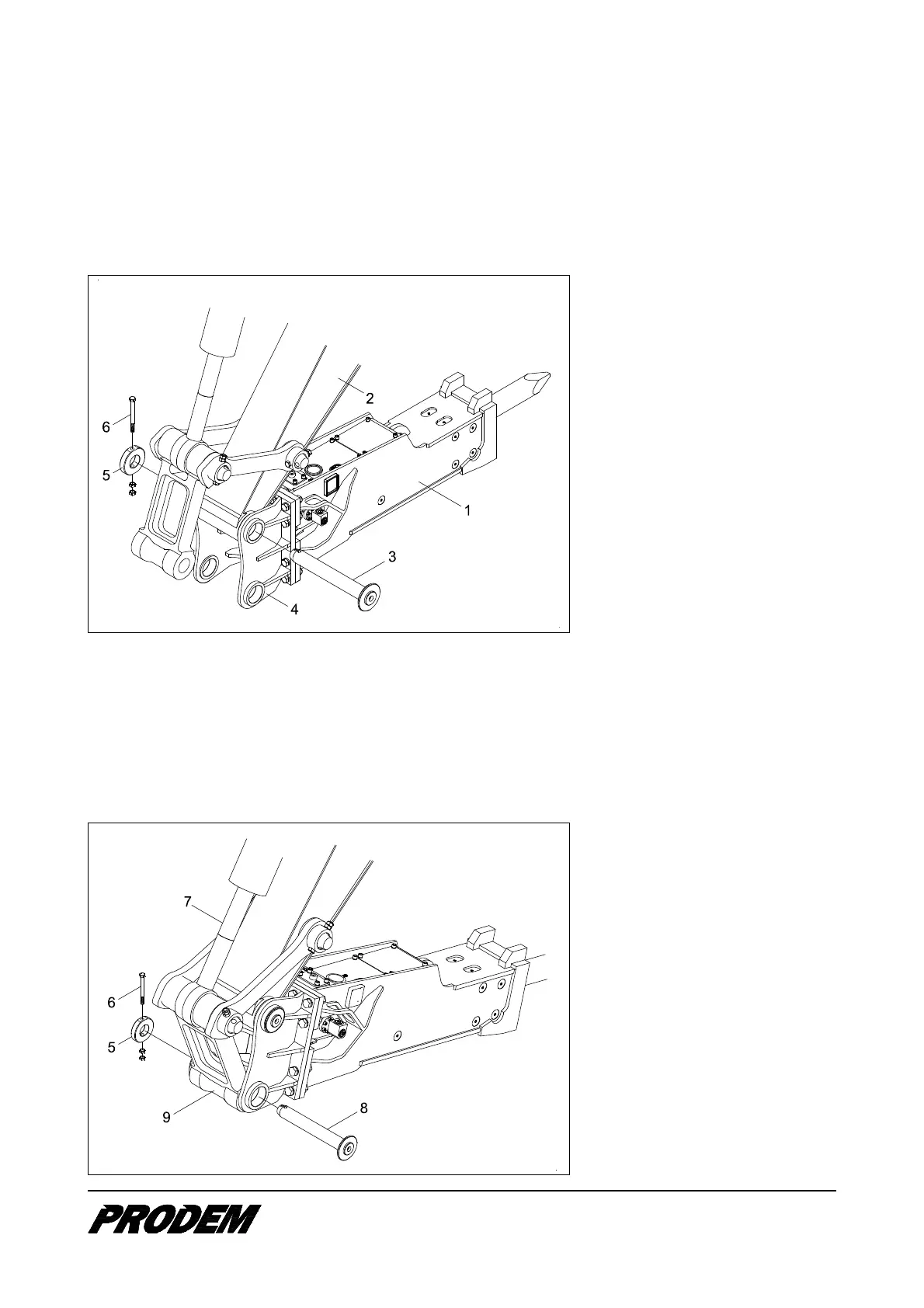 5. Extend the bucket cylinder (7) until the bore in the link (9) is flush with those in the adapter (4).