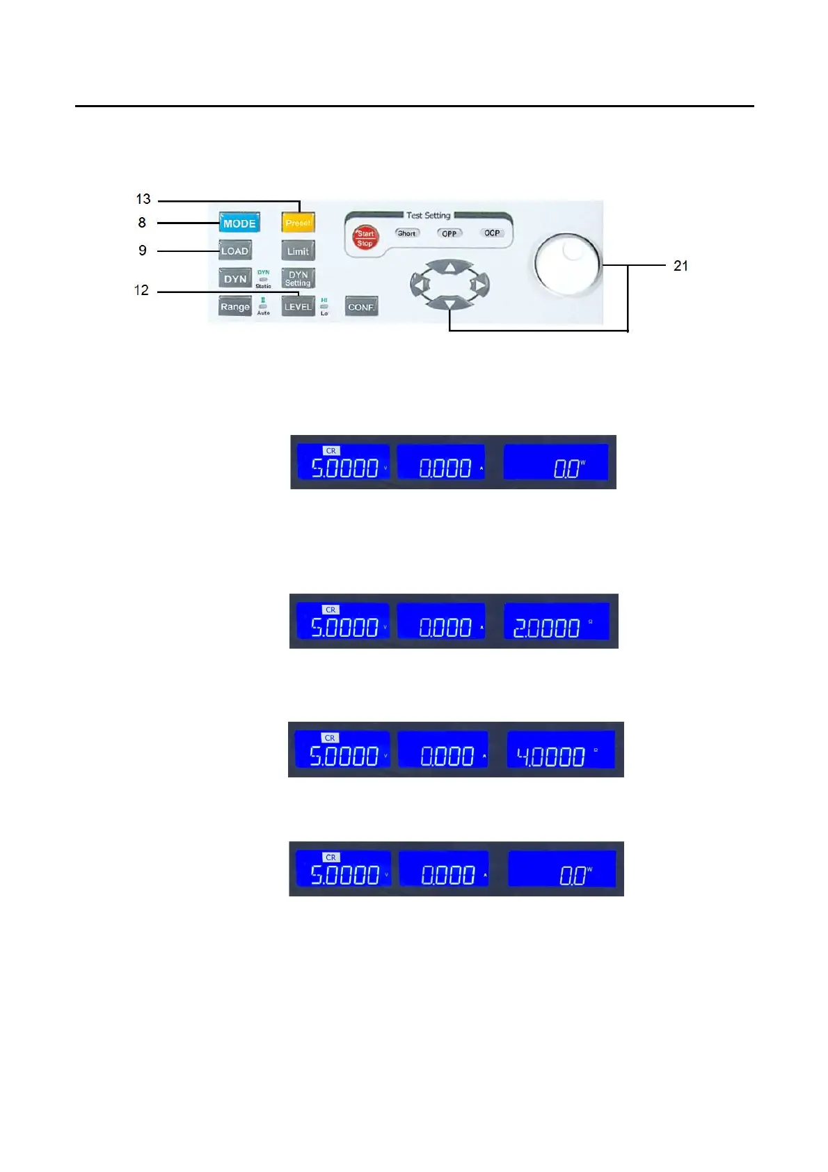 Example: PSU 5 V / 3 A, CR mode, Level HI 2.0 Ohm, Level Lo 4.0 Ohm